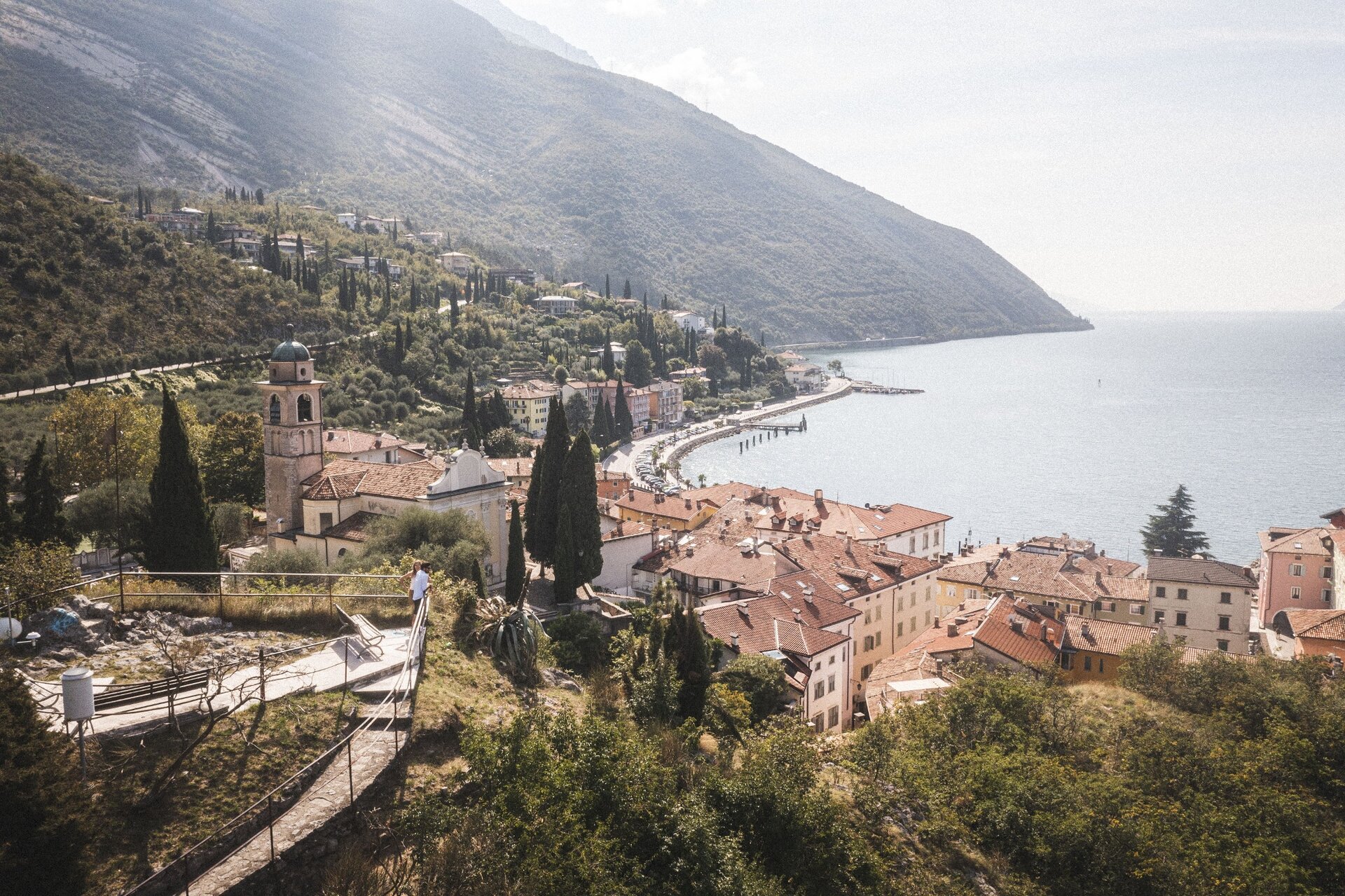 Der Ausgangspunkt der Route befindet sich an der Piazza Santa Maria al Lago in Torbole. Wir schlagen Via Benaco ein, überqueren die Hauptstraße und biegen in Via alla Fitta ein, die durch das Dorfzentrum führt. Von der Piazza Goethe beginnt die Auffahrt Richtung Busatte entlang der Via Riccardo Pontalti. An der Abzweigung halten wir uns rechts und fahren weiter bergab entlang der Via delle Brae, bis wir zum Busatte Park kommen.