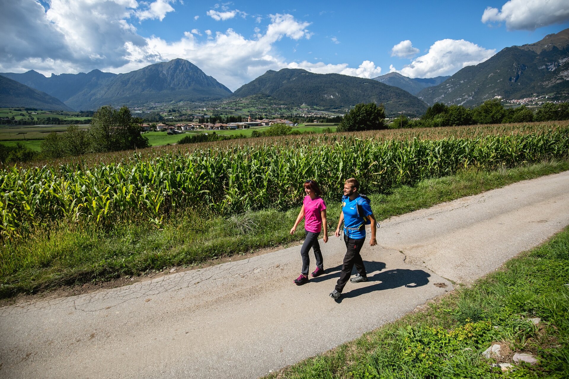 Hier beginnt ein steiler Anstieg Richtung Ortsteil Poia, den du nicht erreichen wirst. Oben am Hügel biege rechts ab nach Vigo Lomaso, entlang einer leicht geneigten Straße, die zur „Ponte Romano“ (Römische Brücke) über den Rio Maseràc und zur Kirche von Vigo Lomaso (Pieve di S. Lorenzo) führt. Diese alte Brücke verband einst die Giudicarie Esteriori mit Sarche, Vezzano und Trento über Vigo Lomaso, Comano und den Passo della Morte. Wenn du den Kirchplatz von Vigo Lomaso erreichst, findest du den Friedhof, auf dem die Überreste von Don Lorenzo Guetti, dem Gründer des Cooperativismo Trentino, der Kooperation von Trentino, (1847 – 1898) liegen. Die Kirche, die S. Lorenzo gewidmet ist, gehört zu den bedeutendsten Pfarrgemeinden in Trentino und ist die älteste im Gebiet der Giudicarie. Nach dem Besuch der religiösen Stätte setzt du deinen Weg entlang des Viehweges fort, der hinten an der Kirche (Ostseite) beginnt und zum Castel Spine führt. Das Schloss, das heute in Privatbesitz ist, thront auf der Westseite des Monte Casale und überblickt das Becken der Giudicarie Esteriori mit seinen Bergen, Dörfern und anderen Burgen. Das Schloss sowie andere in der Talregion stammt aus dem XI. Jahrhundert. Wenn du das Schloss erreichst, folge der Hauptstraße, der „strada provinciale“, die direkt oberhalb verläuft und Lundo mit Vigo Lomaso verbindet. Gehe rechts hinunter durch Obstgärten und Wiesen bis zur Kirche S. Silvestro, die im XV. Jahrhundert erbaut wurde. Diese kleine Kirche, die jetzt Unserer Lieben Frau von Fatima gewidmet ist, beherbergt einige Fresken, die – obwohl nicht mehr im besten Zustand – die Passion Christi und einige Graffiti von Anhängern des Franziskanerordens darstellen. Nachdem du die Kirche verlassen hast, folge der gepflasterten Straße zum Heiligtum S. Rocco und dessen gleichnamigem Brunnen. Nachdem du die Brücke über den Bach Dal überquert hast, geh durch Vigo und schließe dich der Strada Statale 421 dei Laghi di Molveno e Tenno an. Folge dieser Straße in Richtung Ponte Arche, bis du links die Bank Cassa Rurale Don Lorenzo Guetti erreichst. Überquere die Straße und gehe in die Feldweg auf der rechten Seite der Bank; gehe durch die Felder, bis du die Hauptstraße, die „strada centrale della Piana“, erreichst, die von Dasindo nach Campo Lomaso führt. Von hier kannst du Campo Lomaso aus der Ferne rechts mit seinem markanten spitzen Turm der Villa Lutti (heute Villa di Campo) sehen. Folge diesem unbefestigten Weg bis zur Hauptplatz von Campo Lomaso, dem Ausgangspunkt dieses Spaziergangs.