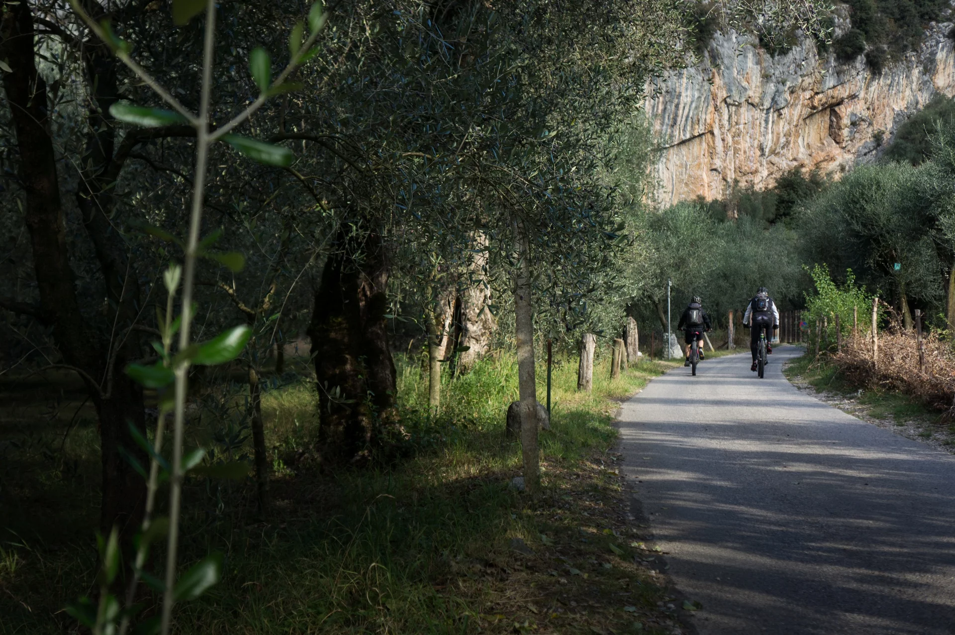 Der Startpunkt der Strecke liegt in Arco entlang des Radwegs neben dem Caneve-Parkplatz. Dem Radweg in Richtung Stadtzentrum von Arco folgend, überqueren wir den Fluss Sarca und fahren nordwärts entlang des Flusses. Wir passieren das Kletterstadion und überqueren den Fluss erneut. Am Kreisverkehr überqueren wir die Hauptstraße und erreichen auf der anderen Seite die von Bäumen gesäumte Straße, die zum Kloster San Francesco führt.