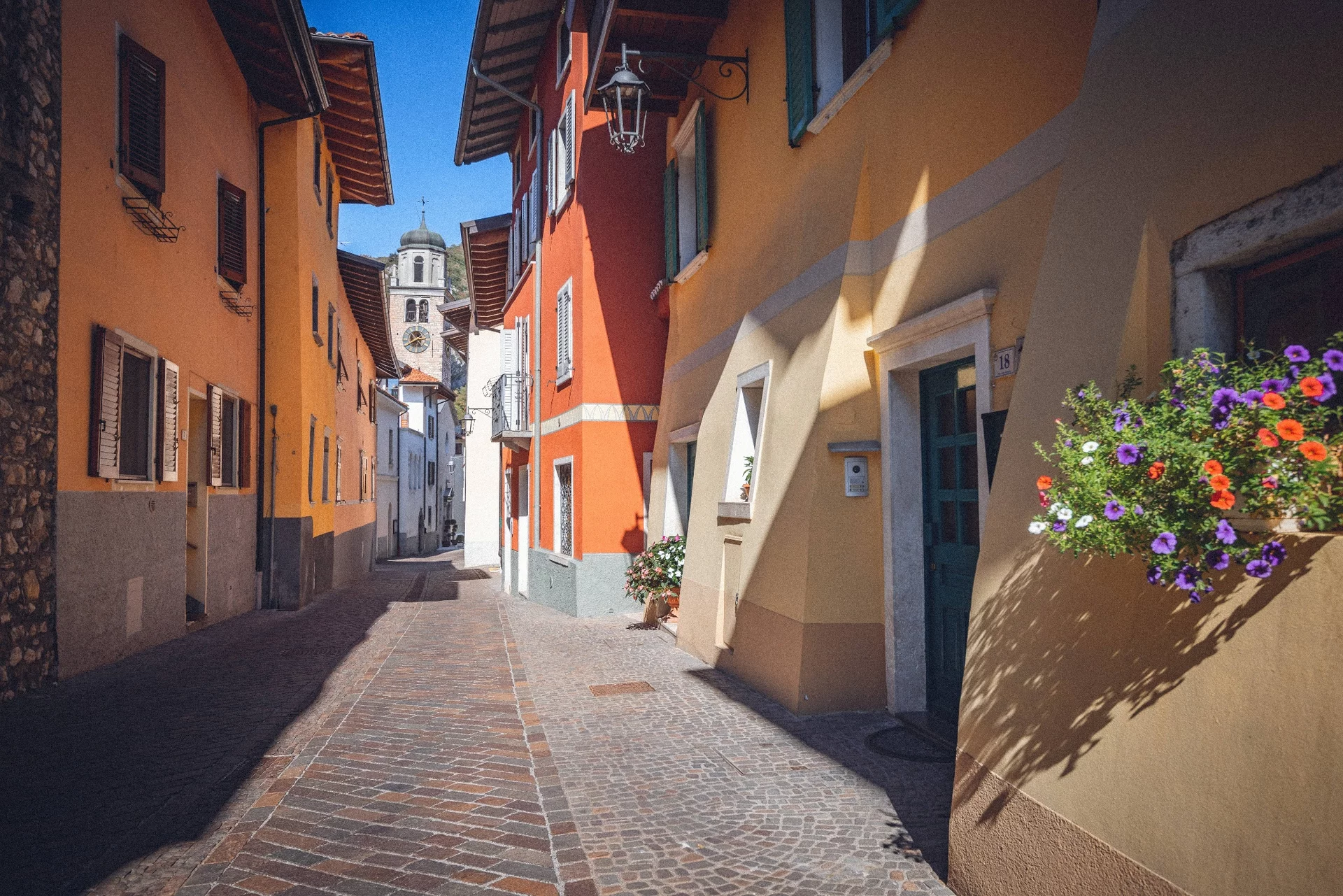 Wir setzen unseren Aufstieg fort, überqueren die Kurve und biegen sofort nach rechts ab. Nach einen kurzen Abschnitt auf Schotter finden wir nochmal die Hauptstraße, auf der wir diesmal für etwas mehr als 1 km bergauf fahren. Wir halten uns dann rechts und nehmen die Via dei Molini, die uns zur Burg von Tenno auf der gegenüberliegenden Seite des engen Tals führt. Am Stoppschild vor der Burg, halten wir und rechts und überqueren nach ein paar Dutzend Metern die Straße, um eine leicht ansteigende Nebenstraße zu unserer Linken zu nehmen. Wir fahren hinauf zu einem Ausblick auf dem nördlichen Gardasee und biegen dann, der guten Ausschilderung nach, in die unbefestigte „Strada del Pil“.