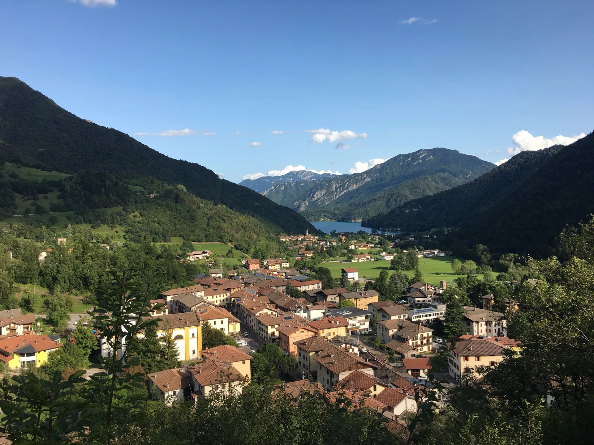 Man braucht nur ein paar Minuten vom Dorf zur Madonnina von Bezzecca, woher man einen schönen Ausblick auf den Ledrosee hat. Das Val di Mulini erstreckt sich unten Wiesen und Scheunen.