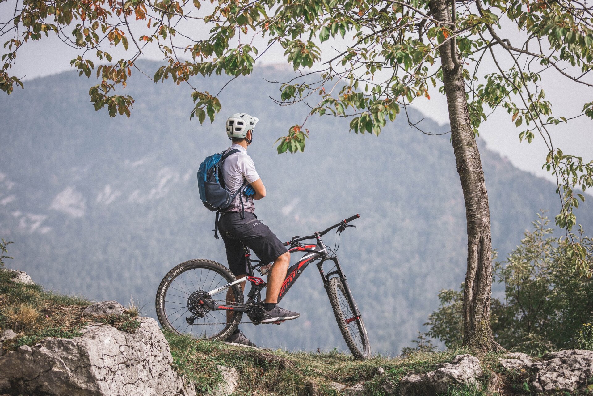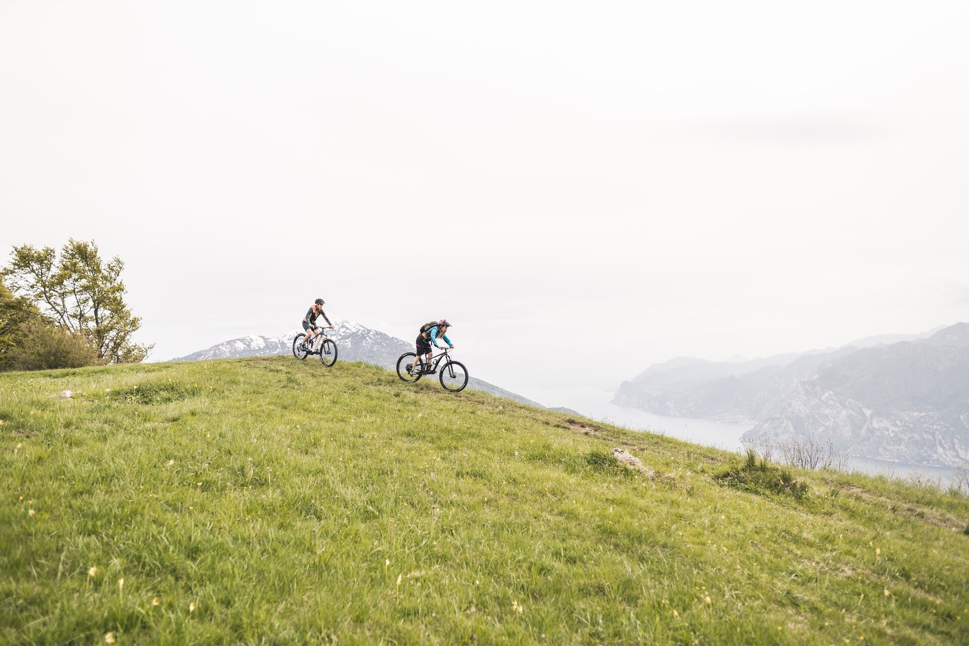 Am Passo Santa Barbara nehmen wir die schmale Asphaltstraße auf der gegenüberliegenden Seite der Hauptstraße vom Brunnen. An der Gabelung biegen wir links ab und folgen dem Asphaltweg durch Wiesen und Felder in Richtung Monte Creino. Anschließend folgen wir den Wegweisern und verlassen die Asphaltstraße, um links in einen Trail einzubiegen, der durch den Wald an den Hängen des Monte Creino führt und zur Forststraße kommt. Danach fahren wir 300 m bergab und biegen rechts Richtung Maso Naranch ab, mit einem wunderbaren Blick über den Gardasee.