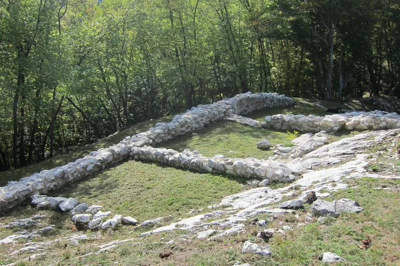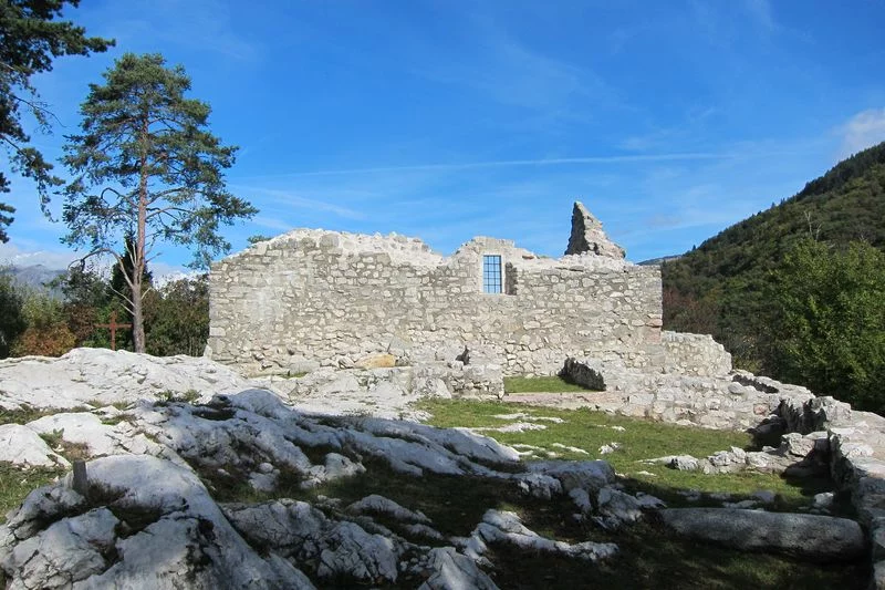 Leichter Spaziergang zur archäologischen Ausgrabungsstätte auf dem Gipfel des Monte San Martino, der das Tal der Giudicarie überragt (nicht zu verwechseln mit dem Gebiet oberhalb des Dorfes Campi)