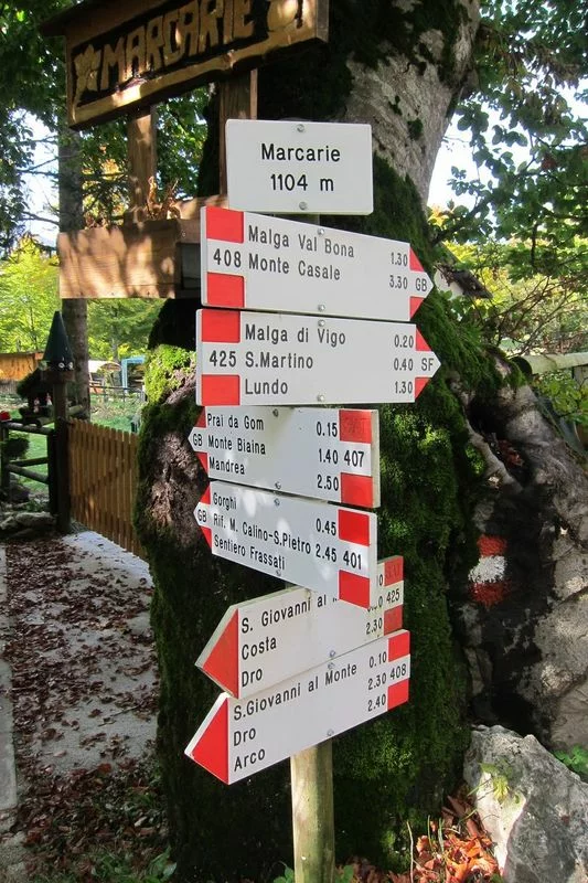 Nach einem kurzen Anstieg geht es abwärts oder flach bis zu den Weiden der Malga Vigo. Nach dem Gebäude der Molkerei erreicht man nach wenigen Minuten die Abzweigung zum archäologischen Gebiet von San Martino. Biegen Sie links ab und gehen Sie hinauf bis zu den Ruinen auf dem Gipfel.