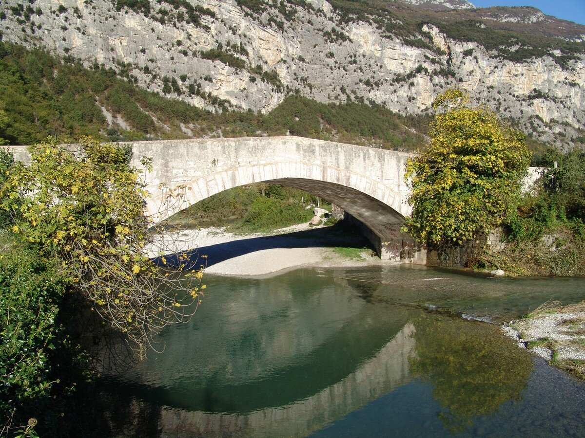 Nach einigen Kehren kommen wir zu einer Weggabelung, wo wir links, in Richtung Cavedine-See abbiegen. Nach einigen hundert Metern beginnt eine kurze Abfahrt zum See. Nun wechseln einander flache Abschnitte mit kurzen Steilpassagen ab. Wir bleiben etwa zehn Kilometer auf dieser Straße, bis wir die Ortschaft Ponte Oliveti erreichen. Wir biegen rechts ab, überqueren die Brücke und fahren wieder bergauf. Nach 1,3 km biegen wir auf der linken Seite auf die Straße nach Calavino ein. Wir fahren durch die Ortschaft und biegen an der Provinzstraße nach links ab. Auf dieser Straße bleiben wir ein paar Kilometer, bis wir nach Vezzano kommen. Wir fahren ein paar Meter auf der Staatsstraße, verlassen diese aber gleich wieder, wenn wir ins historische Zentrum kommen, auf der rechten Seite, und fahren weiter zwischen den Häusern durch. Etwas später treffen wir auf der linken Seite auf die Weggabelung, wo die Strada Provinciale 18 di Lamar e Vezzano beginnt.