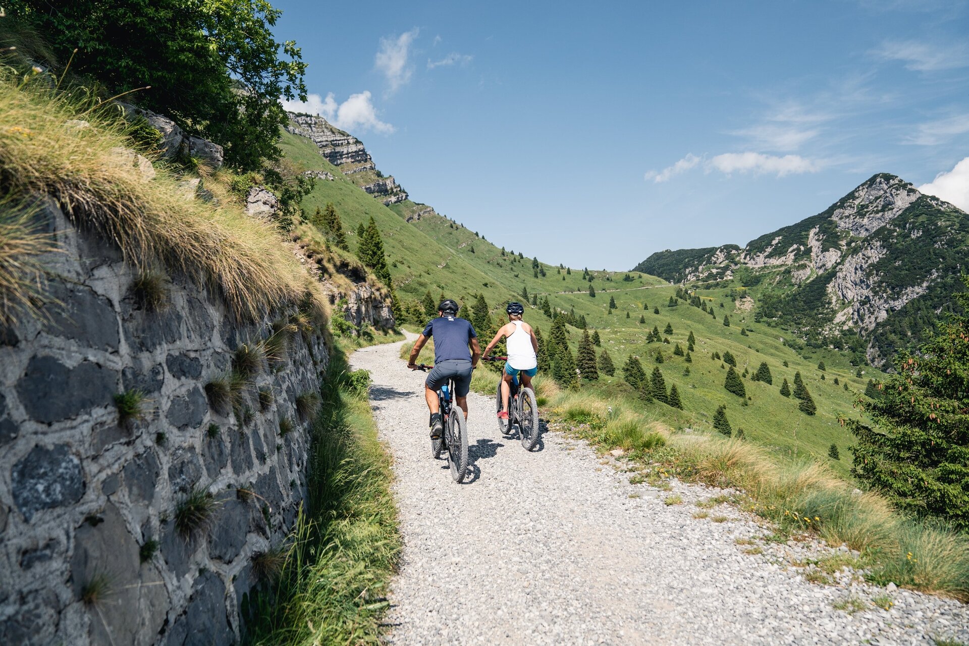 Diese Strecke hat zwei Seelen. Der Aufstieg zum Tremalzo, ein anspruchsvoller Anstieg auf Asphaltstraße mit einer durchschnittlichen Steigung von 7 %, und die Abfahrt, eine Strecke voller Spannung auf alten Militärstraßen mit atemberaubenden Kurven und spektakulären Ausblicken auf den Gardasee. Zum Abschluss der Tour gibt es nichts Schöneres als einen Tauch in den Ledrosee.
