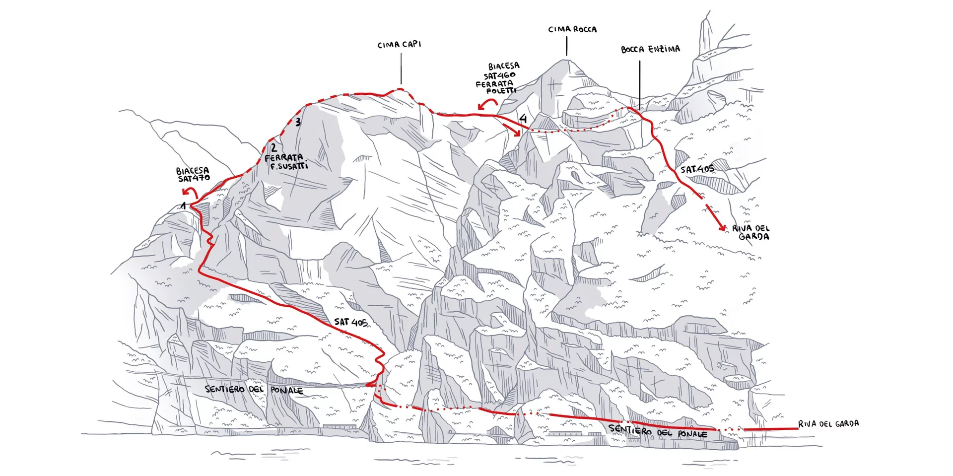 Vom Gipfel gehst du auf der Nordseite hinab, ein einfacher, aber sehr ausgesetzter Abschnitt, bis du zum Sattel zwischen Cima Capi und Cima Rocca kommst. Von hier kannst du nach Riva del Garda oder nach Biacesa absteigen.