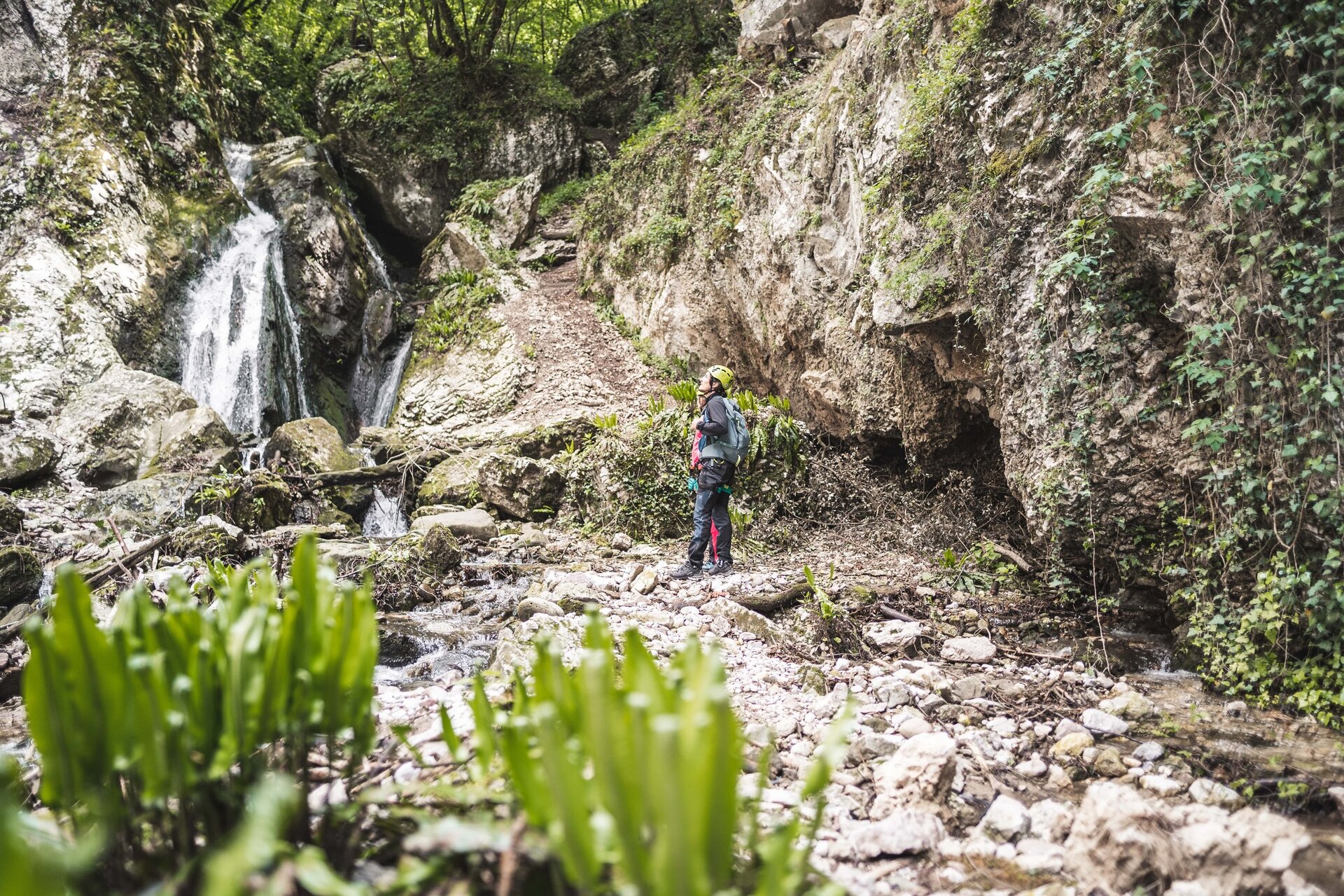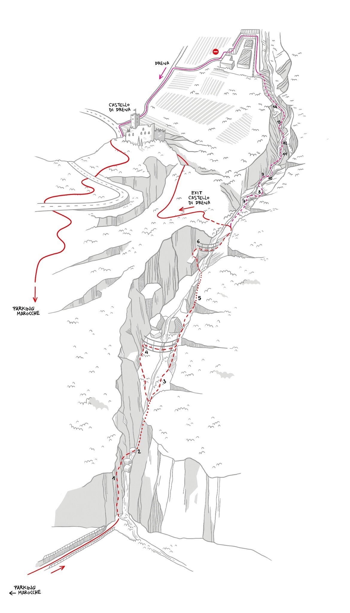 Überwinde den ersten Felsvorsprung, indem du links vom Wasserfall mit Hilfe einiger Steigeisen nach oben steigst, und beginne dann die lange Querung durch die Schlucht, wo es einige anspruchsvolle Abschnitte für jüngere Kinder gibt, bis zu einem offeneren Bereich mit dichtem Bewuchs und Wasserfällen. Du kannst auf dem Weg auf der linken Seite der Schlucht bleiben (3) oder den Bach waten und den Wasserfall über eine tibetische Hängebrücke (4) queren. Nach ein paar Minuten und einer Reihe von Stufen erreichst du eine Passage zwischen riesigen Felsblöcken (5) und kurz danach, beim Überqueren einer zweiten tibetischen Brücke (6), eine kleine Holzbrücke über den Bach. Hier kannst du die Via Ferrata unterhalb der Burg verlassen.