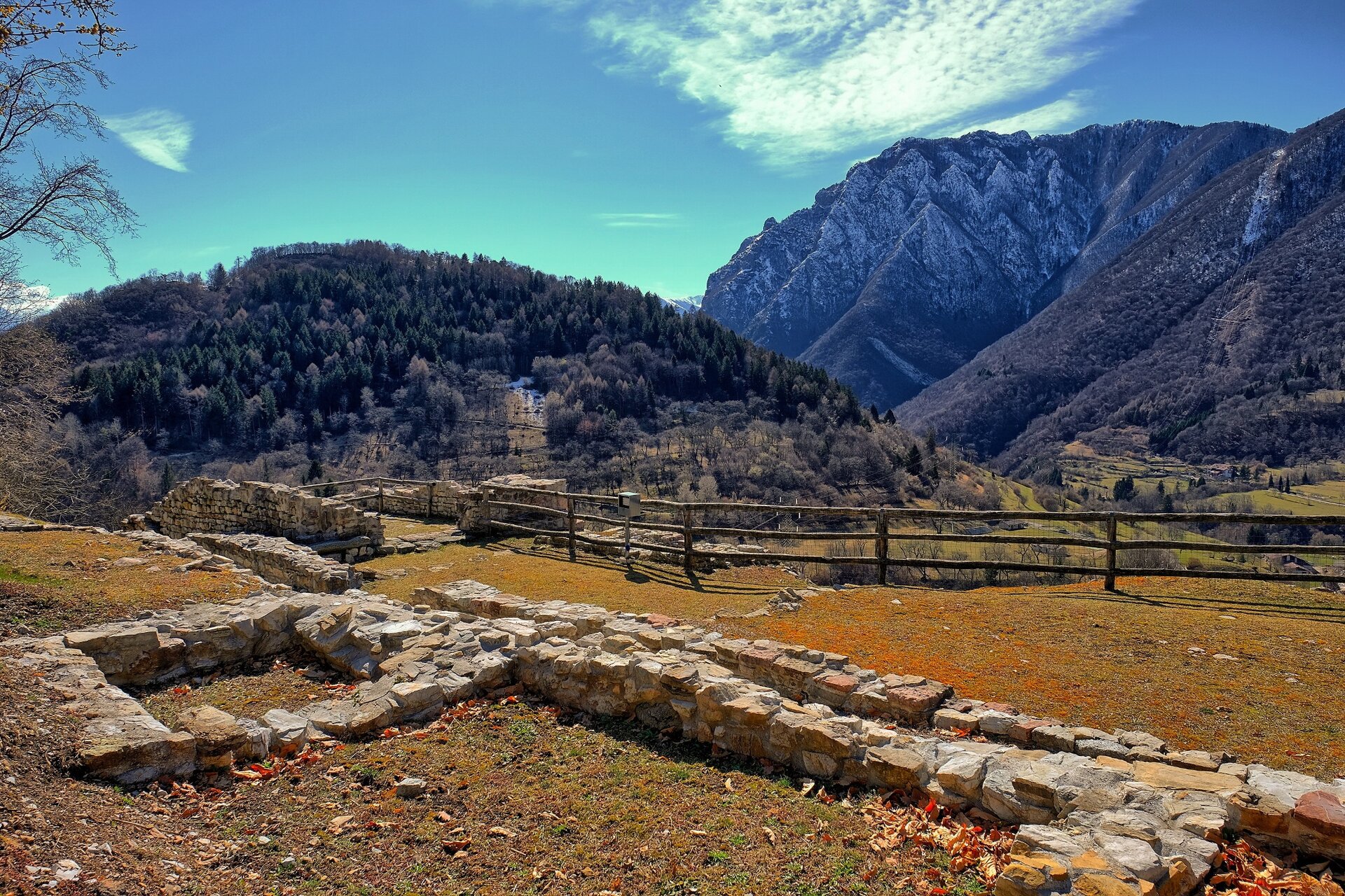 Die Straße windet sich durch Kastanienwälder und steigt Richtung Campi, ein kleiner Weiler von Riva del Garda, eingebettet in ein grünes Tal zwischen den Bergen. Dieses kleine Dorf hat seinen ländlichen Charakter dank der traditionellen Steinbauten mit ihren Holzböden bewahrt. Ziel ist die archäologische Stätte San Martino, eine der wichtigsten der Gegend, etwa 800 Meter über dem Meeresspiegel. Von hier aus hast du einen wunderbaren Blick über die Gegend von Tenno.