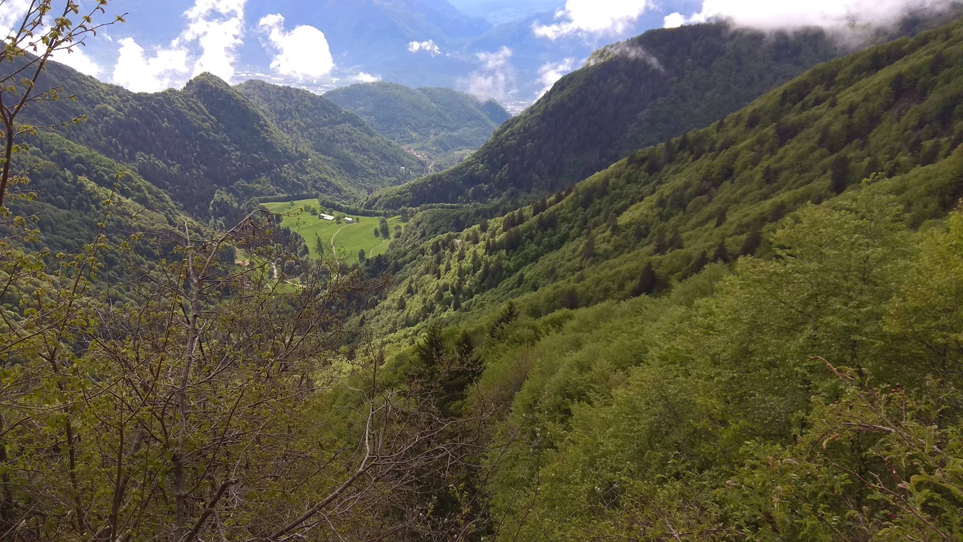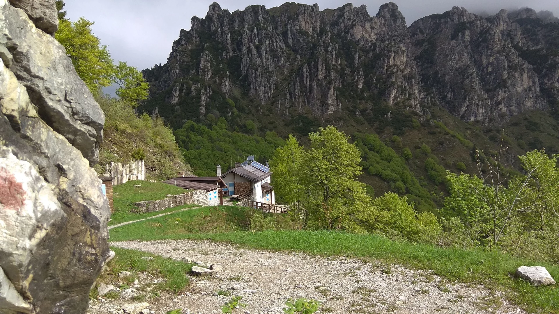 Vom Rifugio aus beginnt die Querung in Richtung Bocca Saval (Sat 413 Weg). Hier, in der Nähe des Militärkrankenhauses, nimm den zunächst sehr steilen Abstieg, der zur Malga/Baita Gelos führt. An der Gabelung unten hältst du dich rechts, um erneut die Malga Grassi zu erreichen, von wo aus du geradeaus auf der breiten Forststraße weitergehst, bis diese asphaltiert wird; an diesem Punkt nimmst du rechts den kleinen Pfad durch den Wald, der vor dem Eingang zum archäologischen Gebiet San Martino herauskommt, das du bis hinunter zum Dorf Campi durchquerst.