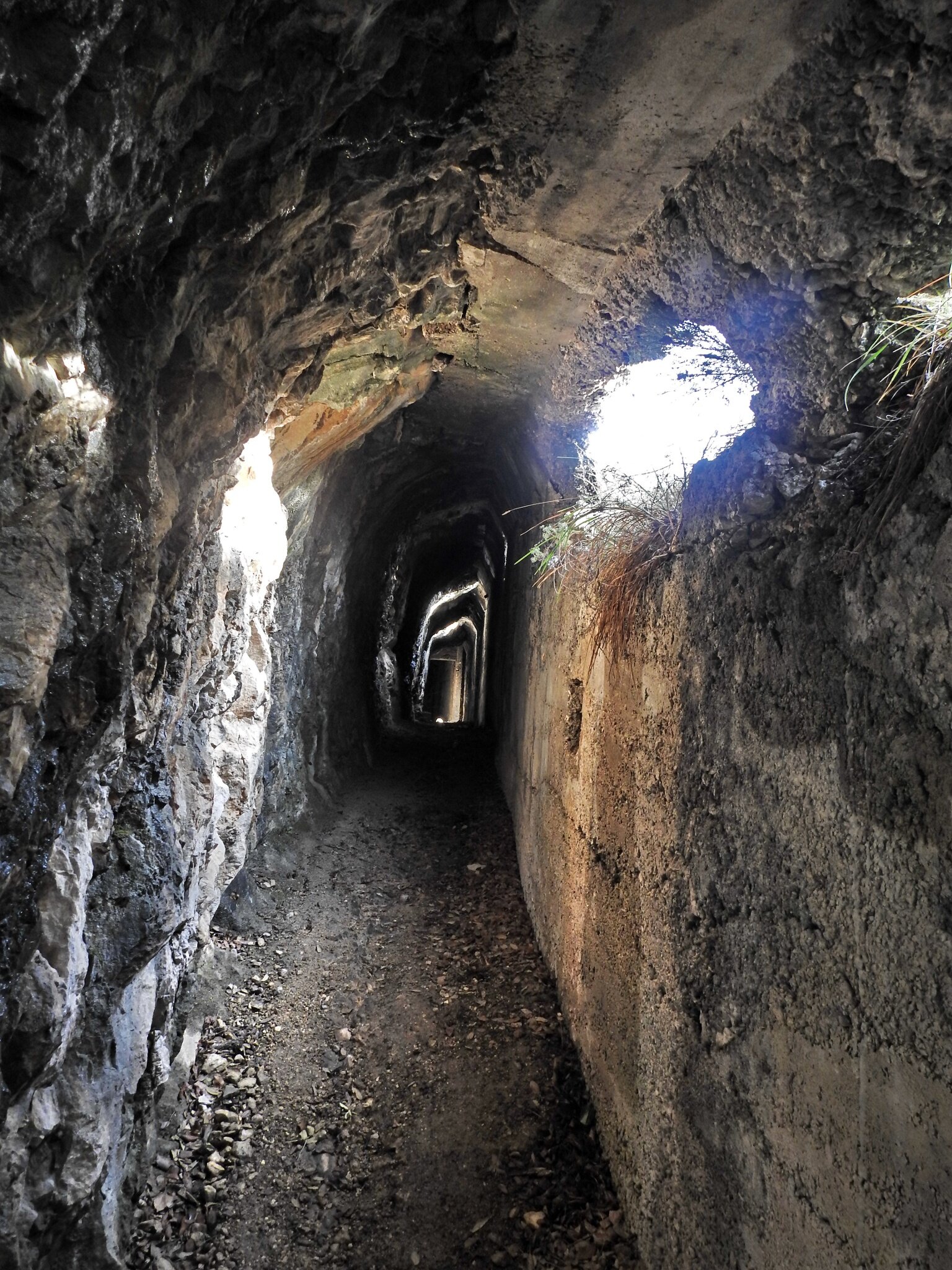 Der Weg zu den ersten Schützengräben ist leicht, aber etwas exponiert; es gibt einen großen Schießscharten-Ausbruch im Fels, den Eingang zu einer Galerie (sei vorsichtig und nimm eine Taschenlampe mit, wenn du sie besuchst) und rundherum Schützengräben und Felswände.