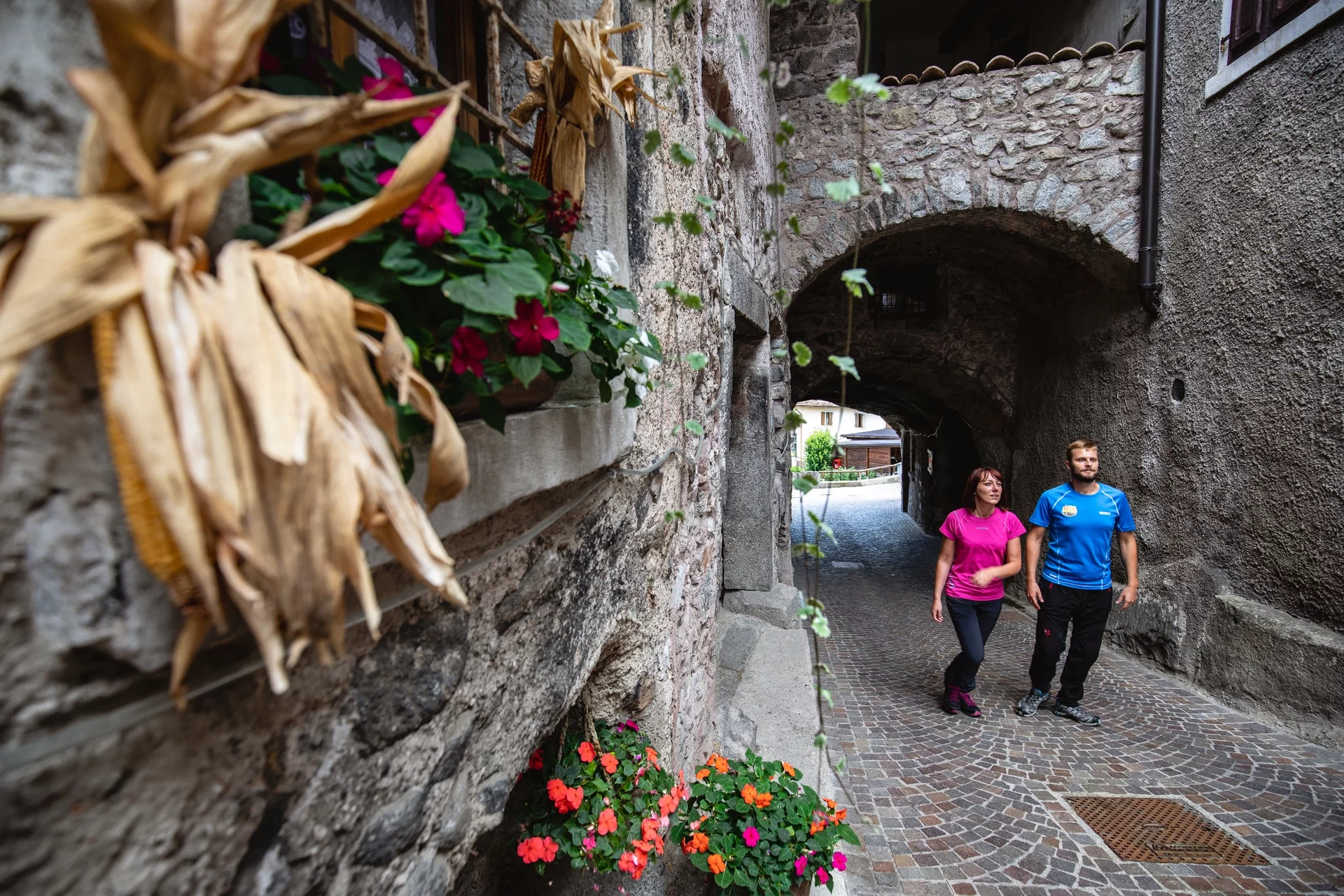 Der "Weg der Kooperation" startet im kleinen Ort Santa Croce, etwas oberhalb der Kirche. An der Kreuzung mit der Hauptstraße biegen wir links ab, steigen hinab zur Kirche San Giuliano, wo wir erneut links abbiegen. Hier beginnt eine flache Strecke, die uns in wenigen Minuten nach Vergonzo führt. Wir gehen weiter immer entlang der Straße, die das Dorf durchquert, und biegen dann links ab. An der Kirche halten wir uns rechts und an der nächsten Kreuzung biegen wir links ab und erreichen die Kirche von Duvredo. Hier halten wir uns rechts und an der dritten Kreuzung links, danach geht es geradeaus weiter, bis wir eine Kreuzung finden, an der wir rechts abbiegen.