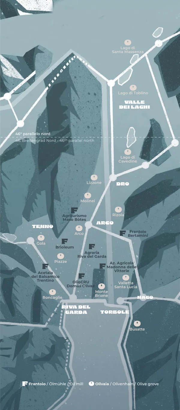 Garda Trentino ist das nördlichste traditionelle Olivenanbaugebiet der Welt, mit Bäumen, die über den 46. Breitengrad hinausreichen.