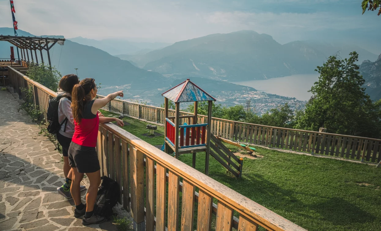 Der Start erfolgt in Riva del Garda mit einem aussichtsreichen Schotteranstieg – perfekt, um die volle Power des eMTBs zu nutzen. Die Route führt an den Hängen des Monte Calino vorbei und durch einen kurzen Waldabschnitt bis zum Rifugio San Pietro, einem bei Locals besonders beliebten Ort mit traumhaftem Blick auf den nördlichen Gardasee.