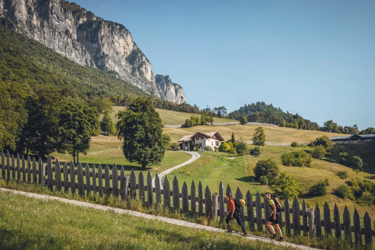 Eine Wanderung durch die ländliche Landschaft des Bleggio, vorbei an kleinen Dörfern und bewirtschafteten Feldern. Die Route führt über ruhige Wege und einfache Pfade, begleitet von Walnussbäumen entlang des Weges.