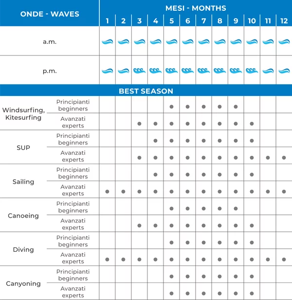 Der Ledrosee profitiert auch vom Einfluss der Ora, die vom Oberen Gardasee zwischen den Bergen an der Einmündung des Ponale-Tals weht. Seine Windströmungen sind stetig, aber nicht zu stark: Diese Bedingungen sind auch für Anfänger ideal!
