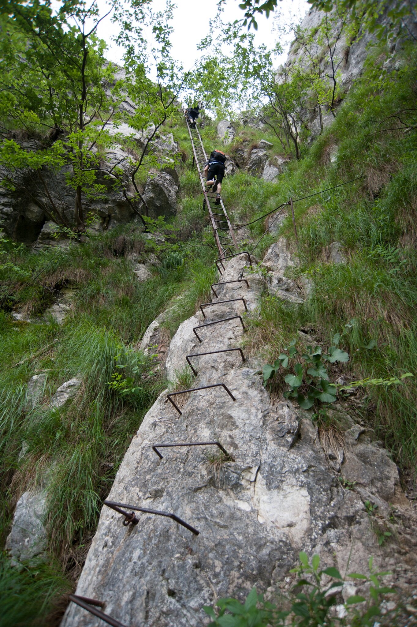 For the descent, take the panoramic path SAT 413 that leads to Bocca Giumella, passing along Bocca Saval and Campigolo. After the pass, take the path SAT 417, which climbs to the summit of Cima Valdes and then reconnects with the SAT 413 up to Bochet dei Concoli. Then descend on the steep path SAT 404 towards Santa Barbara: right next to the church you will find a vertical ladder that must only be descended while securely attached. From here continue to the small church and proceed back to Riva del Garda.