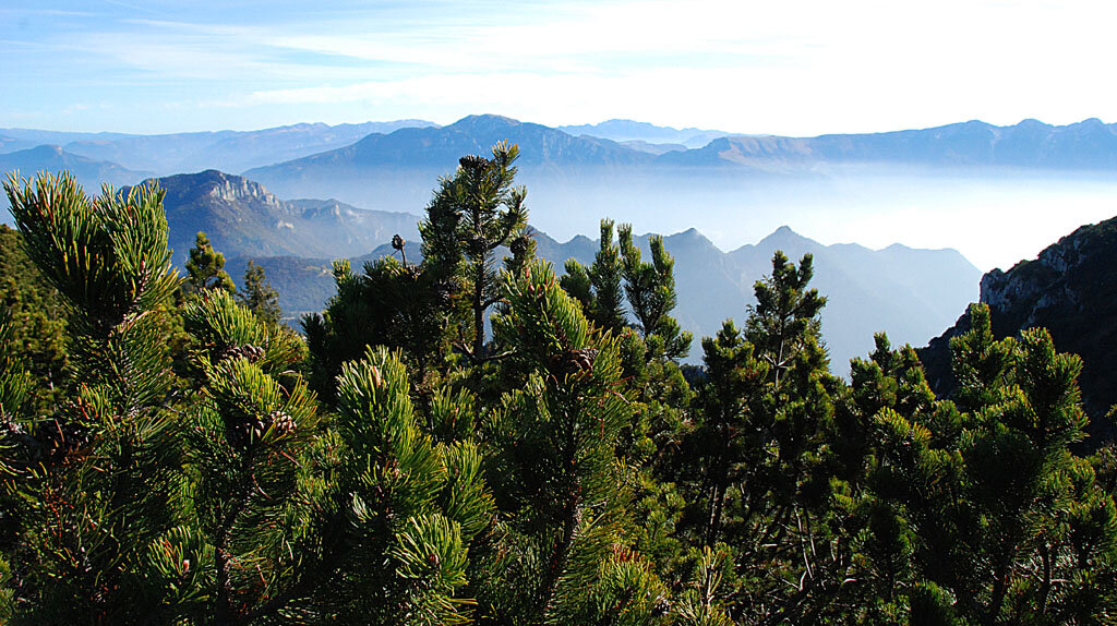 The route alternates the meadows of Tremalzo and Giù to the woods of Caset and the rocks and pines of the Marogna. From the Corno della Marogna the eye can sweep all around. Northwards towards Valle di Ledro, westwards towards the Adamello group, to the east towards Lake Garda and to the south towards the Alpine foothills.