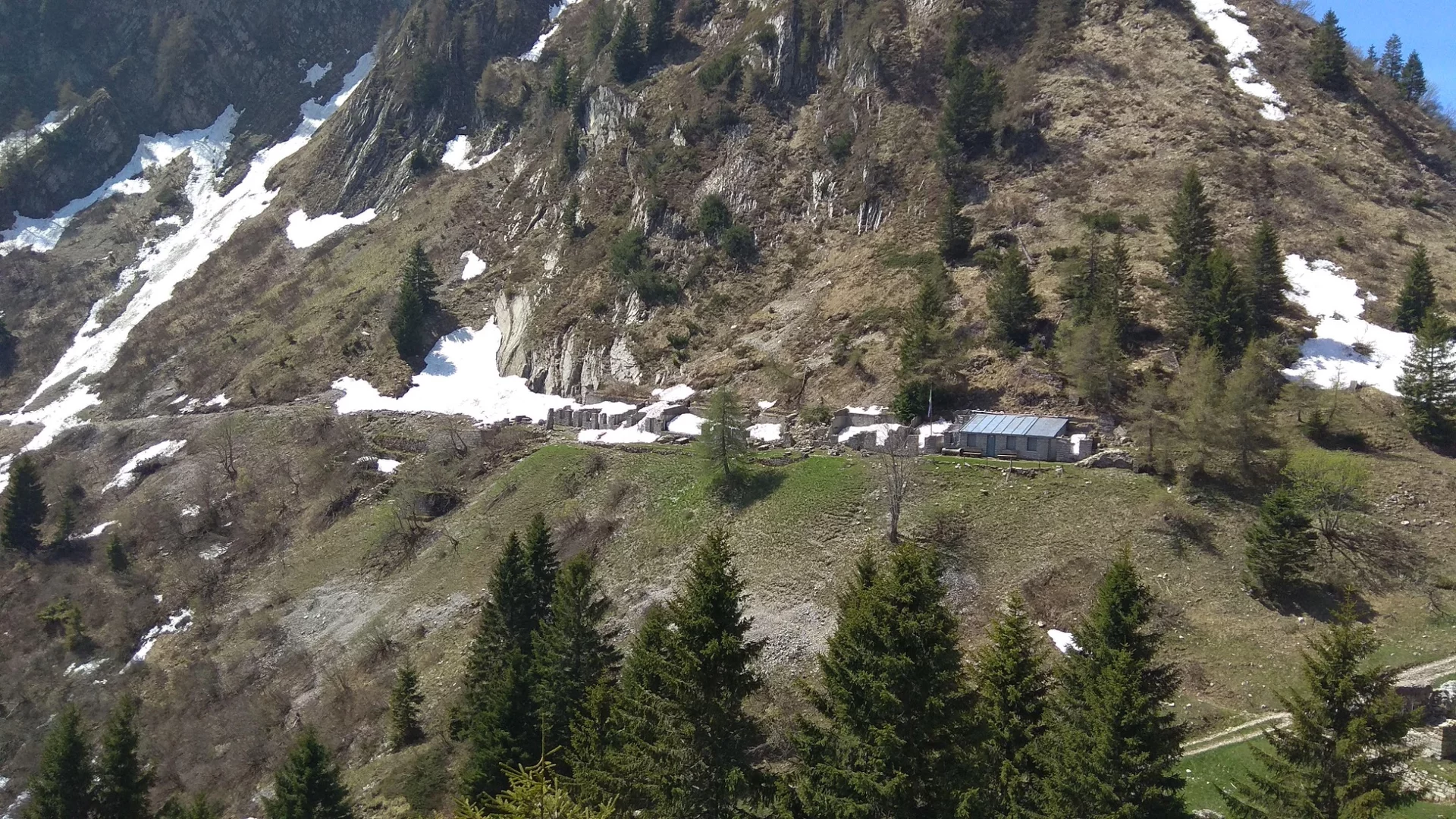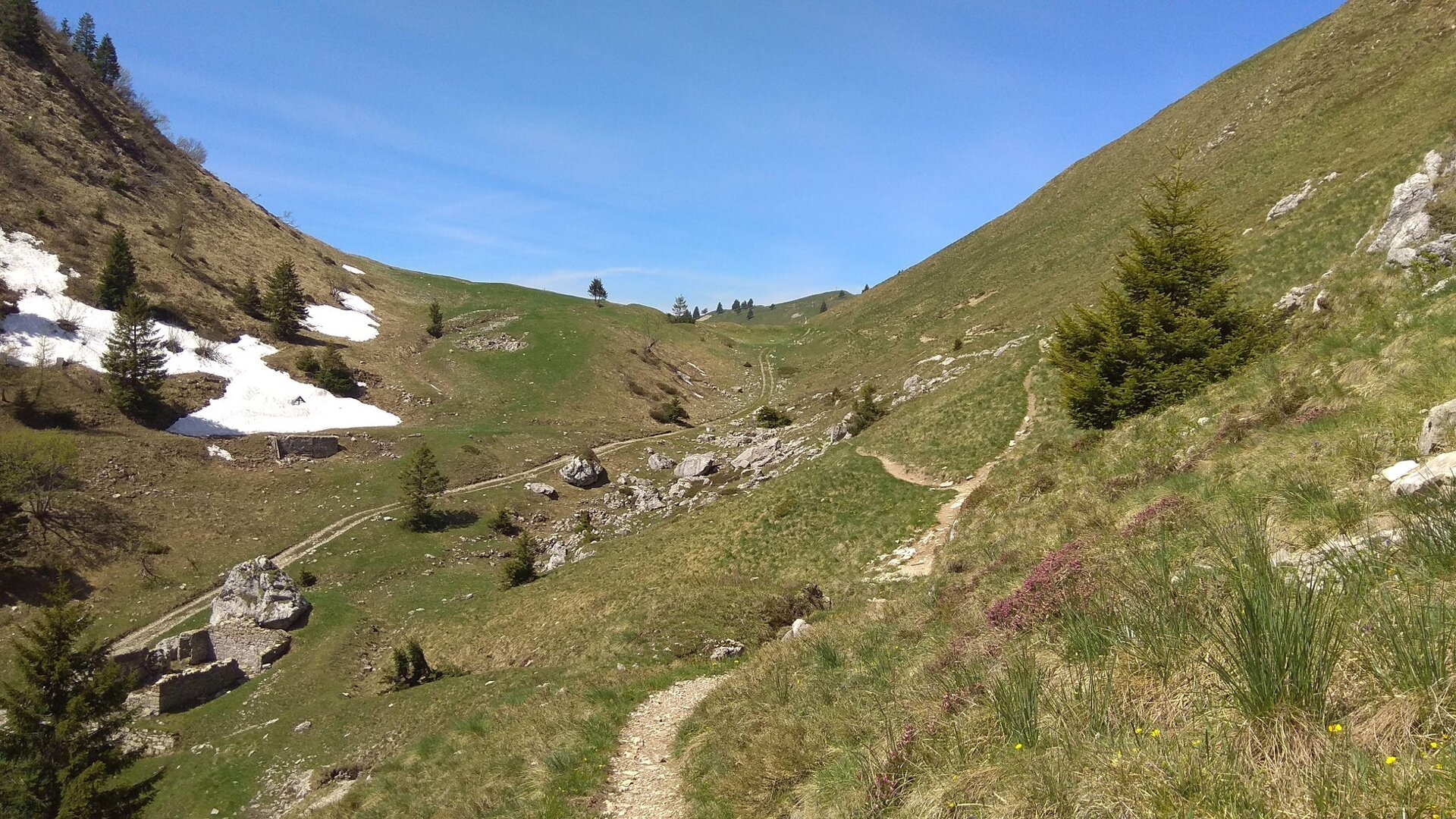 From the refuge, the crossing towards Bocca Saval (Sat 413 trail) begins. Here, near the military hospital, take the initially very steep descent that leads to the Malga/Baita Gelos. At the fork below, keep to the right to reach Malga Grassi again, where you continue straight ahead along the wide forest road until it becomes tarmac; at this point, on the right, take the little path through the wood that comes out in front of the entrance to the San Martino archaeological area, which you cross all the way down to the village of Campi.
