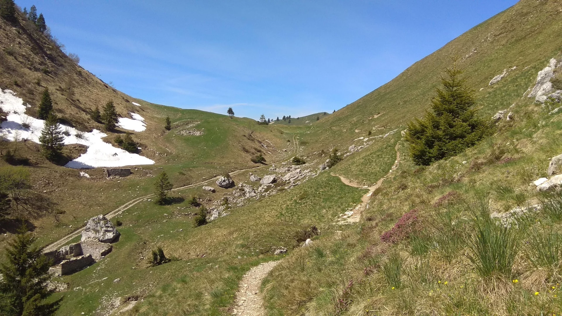 Water points: if you're passing through in late spring/summer, fill up at Campi where there are a few fountains.. Afterwards you will only encounter the stopping points of Rifugio Pernici and Malga Grassi (check the opening periods).