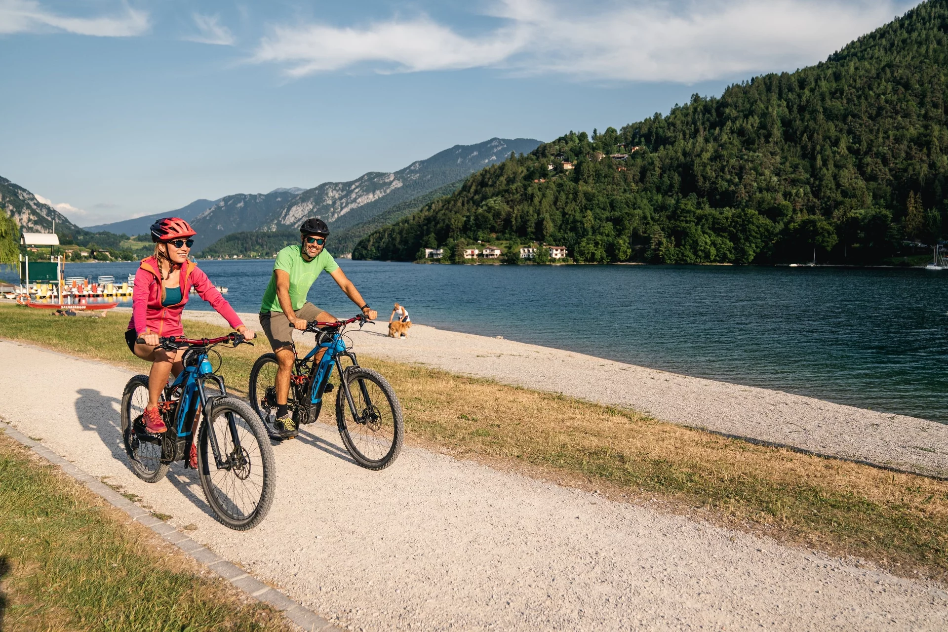 From here we continue our descent along Via Dromaé to the village of Mezzolago (or alternatively we can turn right and follow route 729a. Variante Dromaé). Just past the church we turn left into Via Belvedere, which soon rejoins the main road. We follow the main road in the direction of Molina for about 1 km and turn right at the pile dwellings and continue skirting the lake along Via al Lago and Via Val Maria as far as Pur. At the crossroads we keep to the right, pass the beach and continue along Via Mal Maria. After about 1 km, at a hairpin bend, we take the cycle path on the right, which leads to the Pieve sailing club. From here we continue along Via Alzer and turn left at the first opportunity to rejoin the cycle path. This briefly rejoins Via Alzer and then turns left and runs alongside the stream for 1 km, after which it rejoins Via Imperiale. We turn right to return to our starting point.