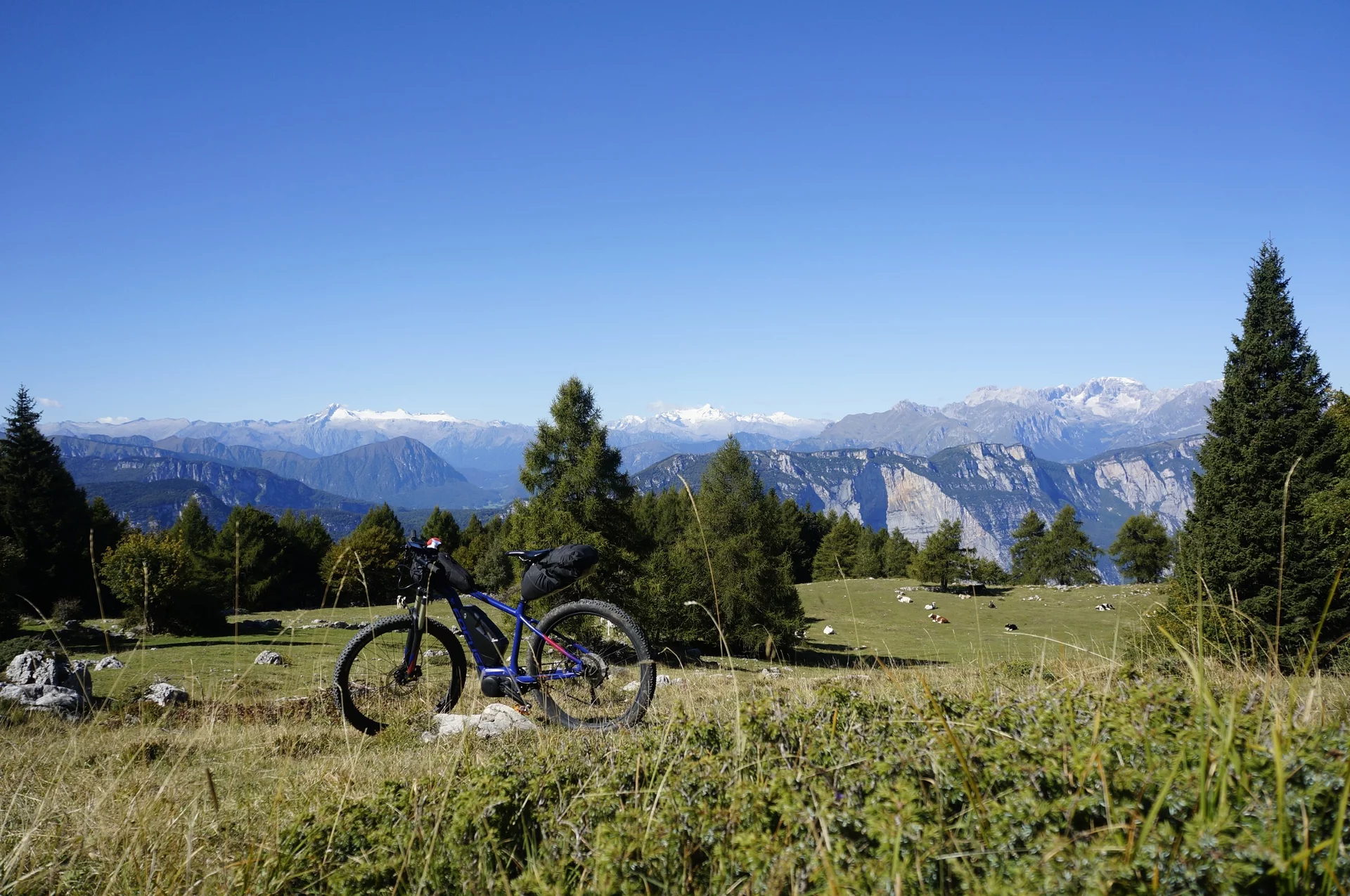 Starting from Arco, cycle the first eight flat kilometres through the Sarca Valley between grapevines and apple trees, before beginning the first climb up to Drena. You then pass through the village. After its last houses, take the road that leads to Malga Campo. A carved wooden board at the start describes the route: sixteen hairpin bends, all with names, lead in a constant gradient up to the alpine pasture. You could have cycled this far on a road bike, but from here things continue on gravel paths. Initially they are level and cross alpine meadows, but they get steeper as they pass forests and rocky terrain until you arrive at the highest point of the tour at a prominent wayside cross. Then begins the long descent via Carobbi to Braila, from which you can coast back to Arco on tarmacked minor roads.