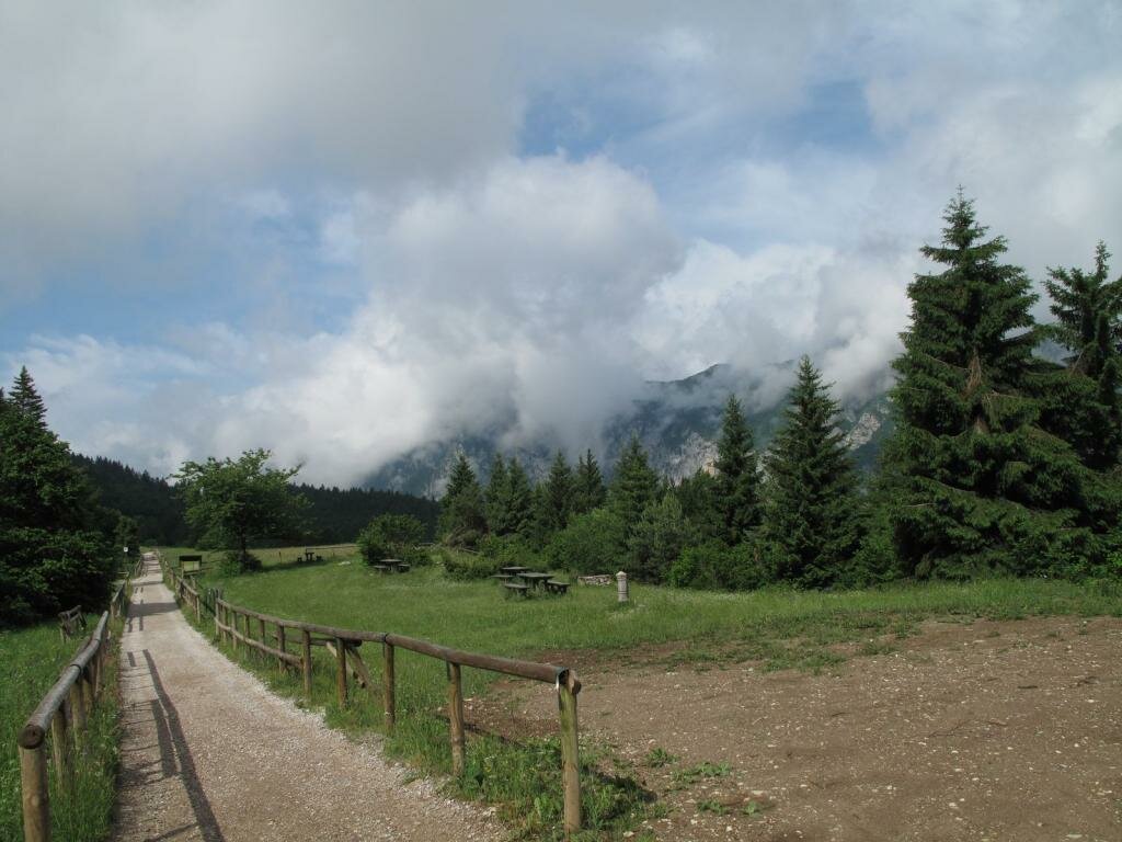 At an altitude of 1395 m the trail crosses over the ridge in a south-east direction and reaches a clearing in the forest. In the clearing there is a dirt road that climbs up from the valley and proceeds to the right. Reach the road and shortly after, on the right, you will see on a tree the typical red/white SAT sign with black lettering on a white background: a cross.