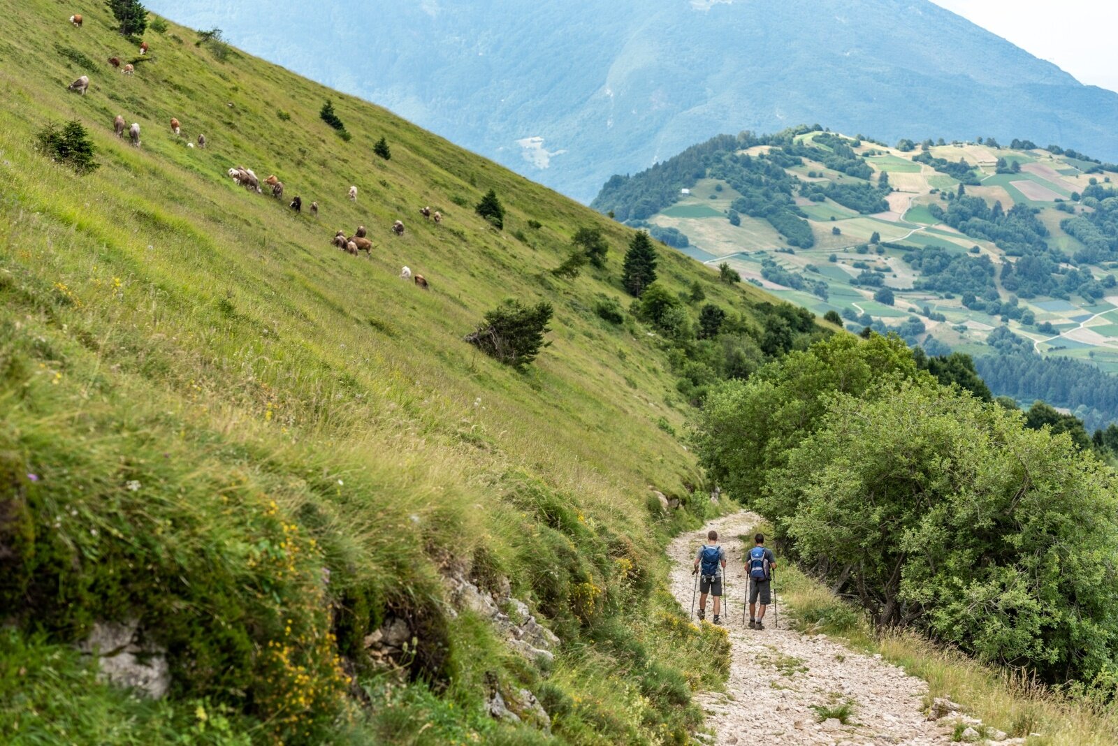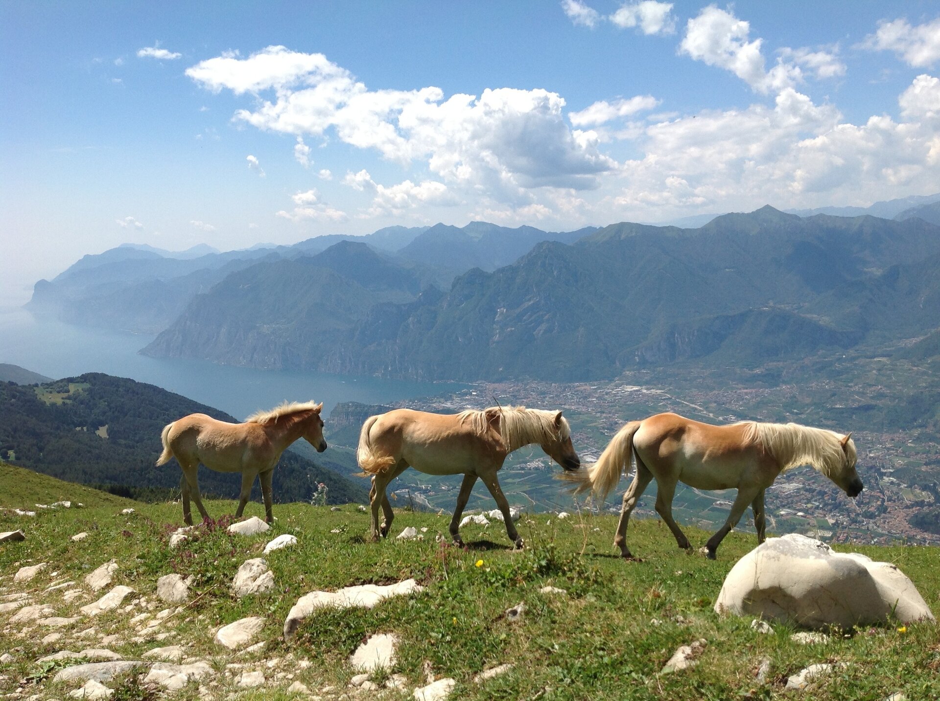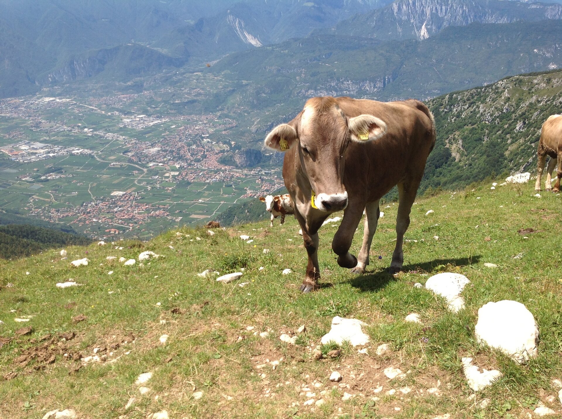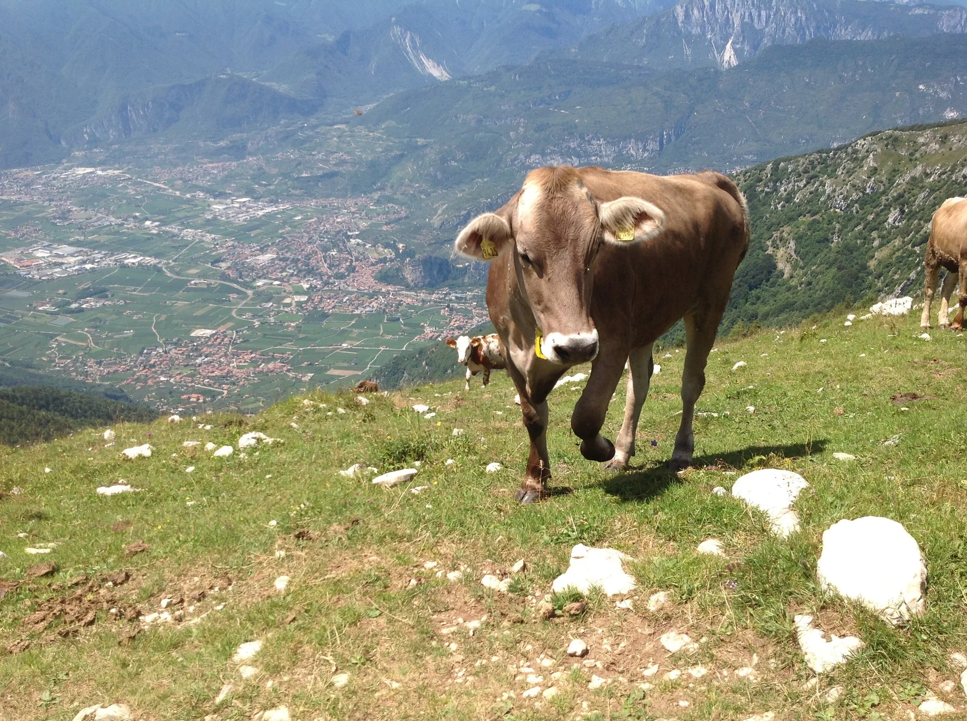 The trail soon takes you above the woods and onto the wide open pastures which cover the summit of Monte Stivo and are clearly visible from the Basso Sarca. You are likely to come across cows and horses grazing on the pastures. Monte Stivo is an imposing presence in Basso Sarca, its bulk towering above the "Busa" (the flat lands between Riva del Garda, Arco and Torbole).