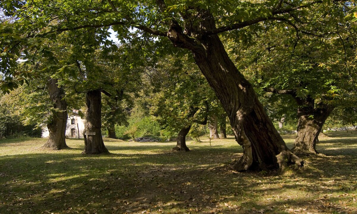 Once we reach Pianaura, we reach a fork and turn right to continue the climb towards Troiana, where the asphalt gives way to a dirt road, and Carobbi, a nice spot surrounded by beautiful chestnut groves. From Carobbi the forest road continues uphill in the direction of the Passo Due Sassi. Here it's definitely worth making a stop to admire the view over Lake Garda from one of two large rocks.
