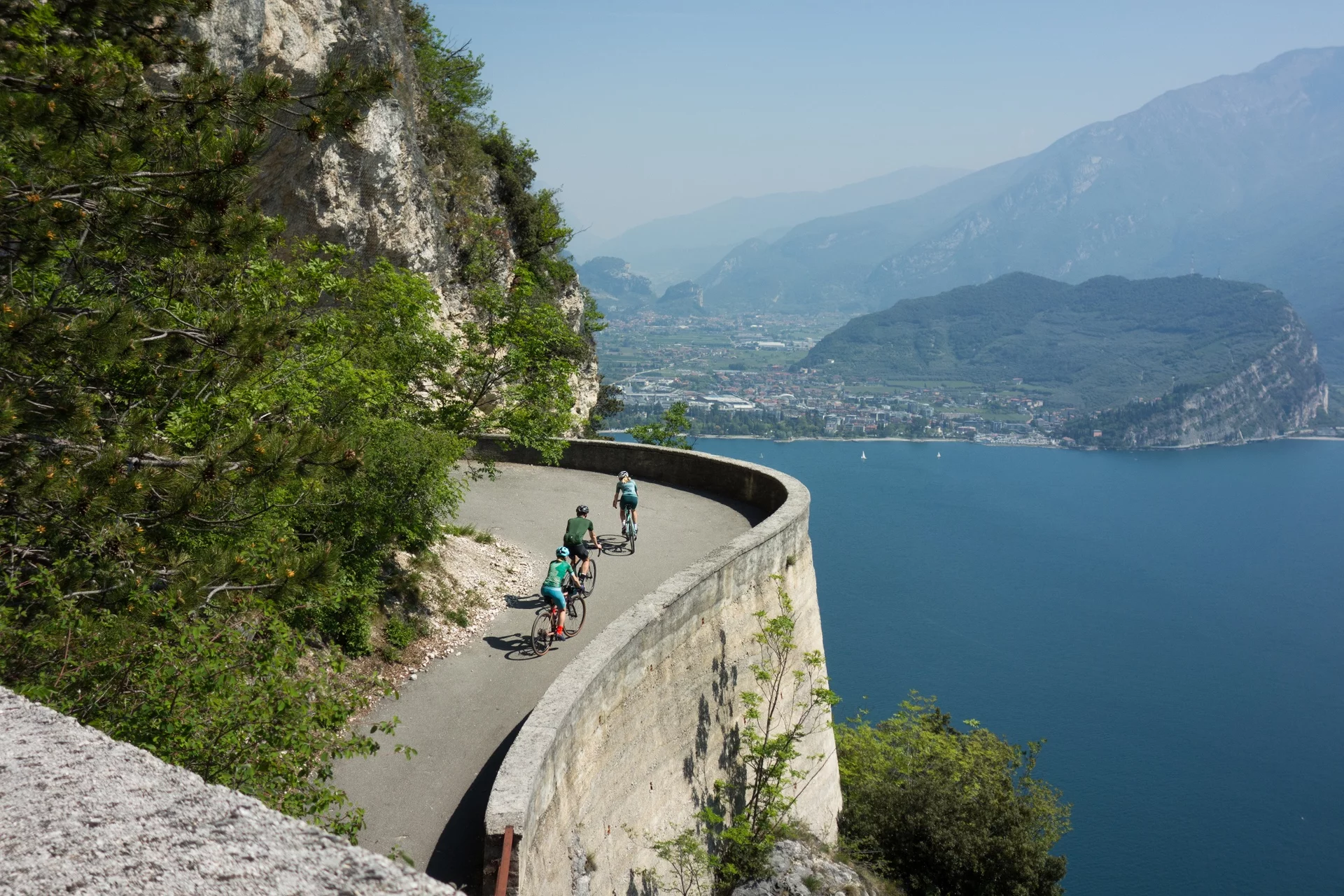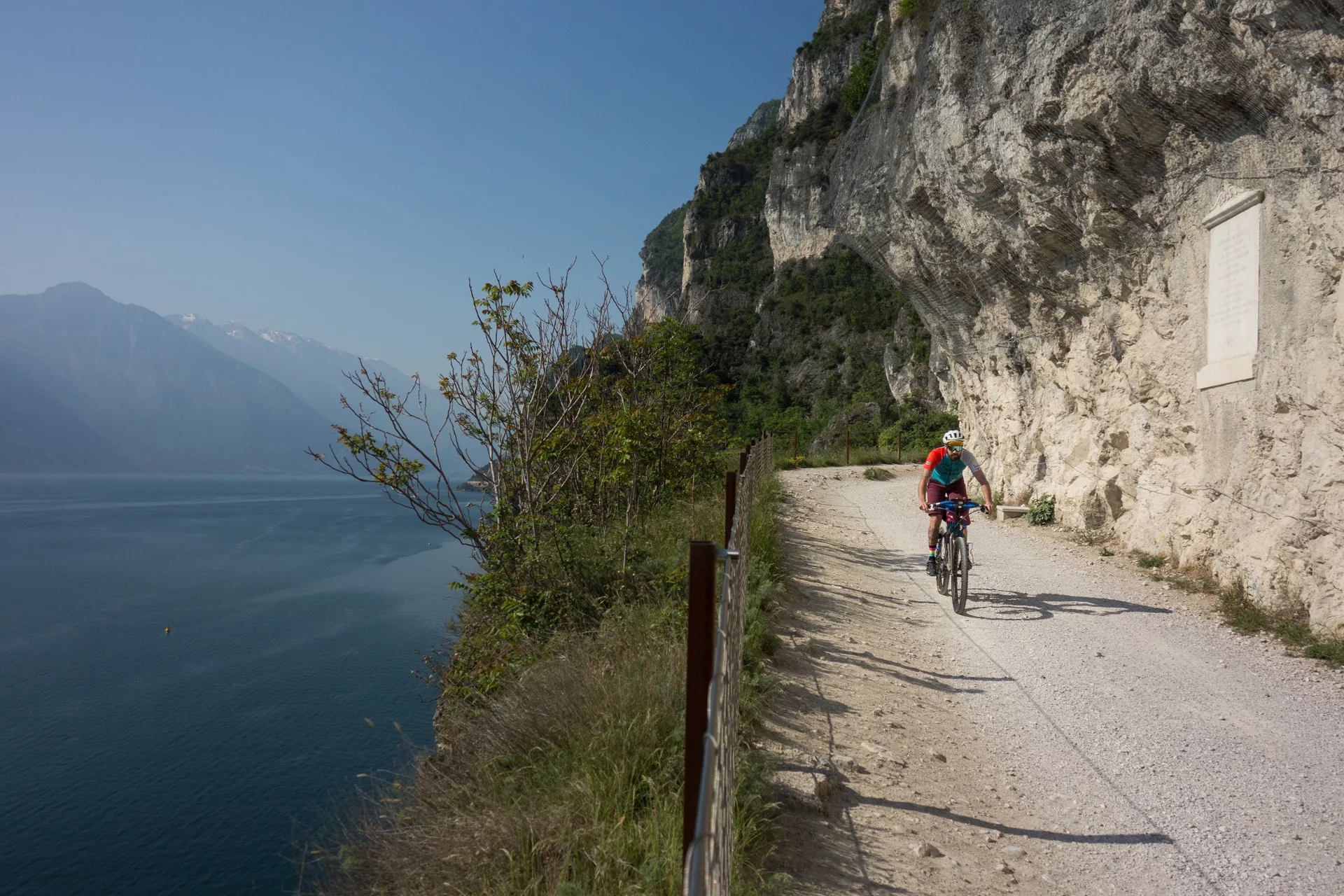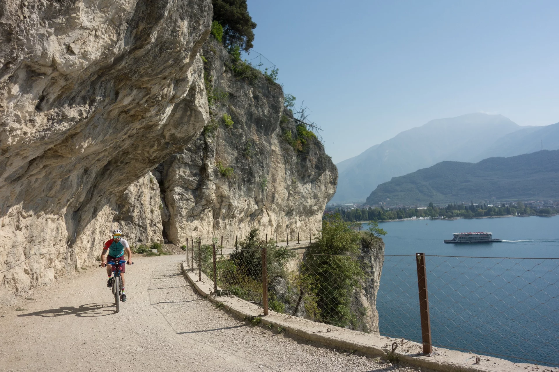 This renowned route is easily recognizable, starting from Piazza III Novembre in the heart of Riva del Garda. Following the lakeshore, you head south, crossing the pedestrian and cycling path that guides you to the entrance of the Ponale Trail. The trail's entrance is situated near the first tunnel on the Gardesana road towards Limone. Once on the trail, simply follow it, taking in the breathtaking scenery as you pedal along. At the end of the dirt section, shortly after passing a refreshment point, stay left and continue the ascent towards Pregasina. Upon reaching the end of the car-free section, the main road awaits at the tunnel entrance. Stay left at this point, continuing on the main road and ascending further until you reach the church that overlooks the quaint village of Pregasina. For the descent, we recommend following the same route back down hill, with the exception of a short segment. To take the short detour, proceed straight at the first right hairpin turn after leaving the village. Note that this alternative route is mostly cemented and features steep hills. If you prefer to avoid significant slopes, can can stick to the route used to ascend.