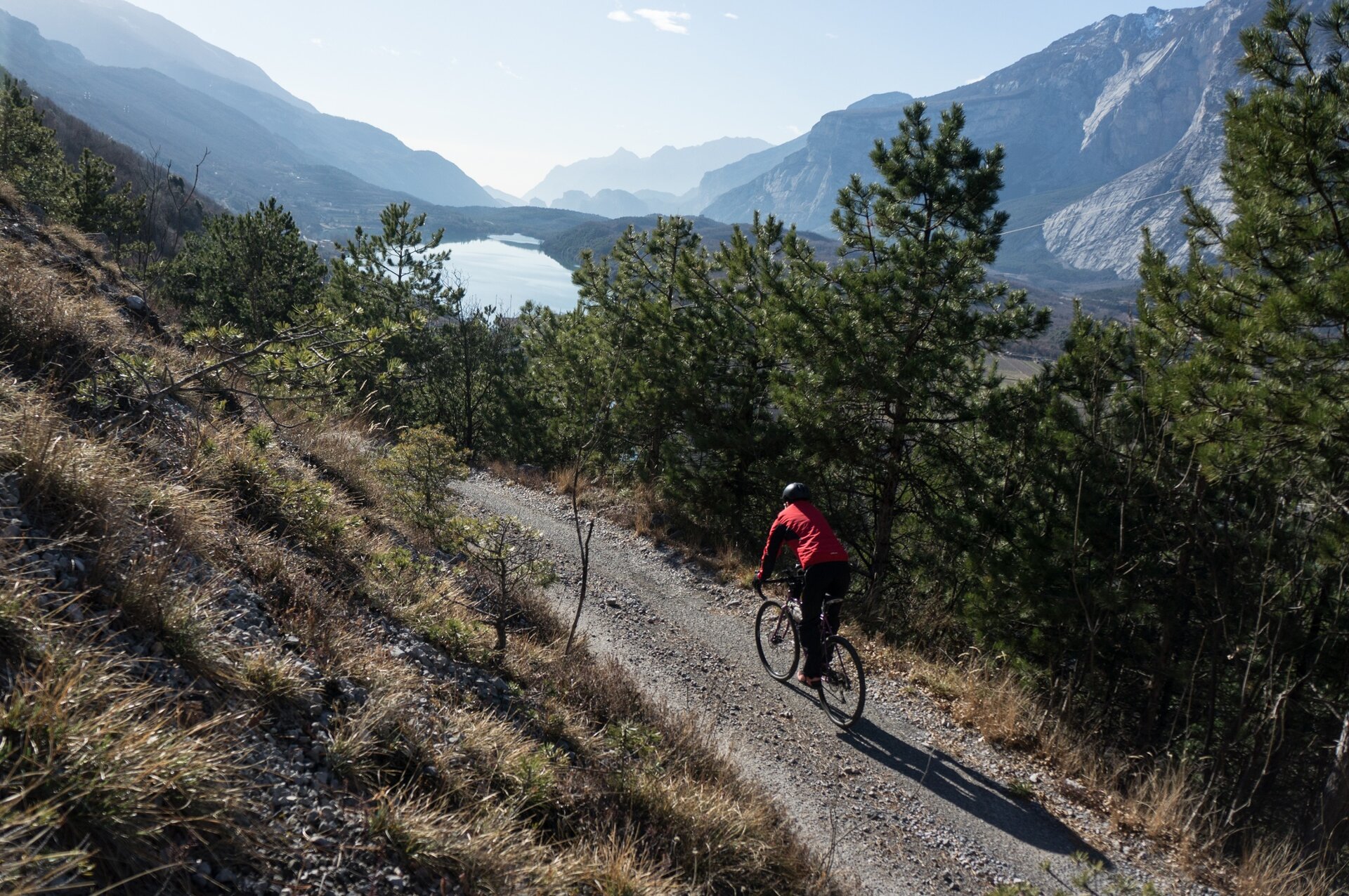 The starting point of the route is in Trebi. Coming north from Dro you will find the first sign for route 753 to your right, at the forked road. However, starting from the south of the lake, continue south for a few dozen meters where you should take the first road on your left. Here you will quickly find the route signage which guides you uphill, through the locality of Trebi. Continue to climb on the main road, where the gradient is constant at around 10%. Quickly gaining altitude, you’ll have the possibility to admire the remarkable views of Lake Cavedine and the Sarca Valley.