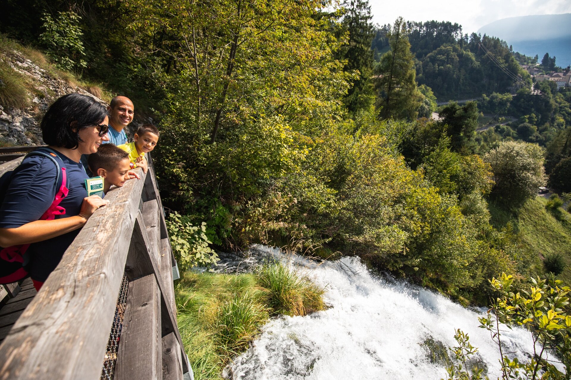 Rio Bianco Waterfall, a water source directly from the mountains of the Adamello Brenta Natural Park and BoscoArteStenico, with artistic works amidst nature