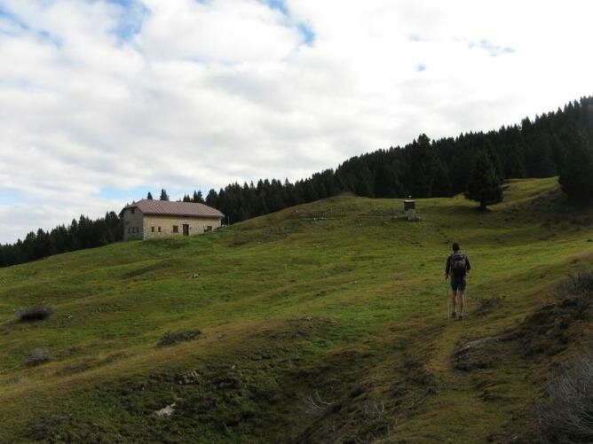 When you have passed the water station, you step into the pastures around Malga Dablino (or what is left of it) and further on Bait dei Caciadori, The Hunters’ hut. Here, you will find a tucked-away corner where you can take shelter. It’s a fantastic location: a secluded and intimate basin from which you can stare in awe at the Val Marcia peaks, Gavardina, Rodola, Altissimo and Cima Pala. After, retrace your footsteps back to the starting point. Tip: those who wish to shorten their itinerary can drive to the “Livèz” area. This will cut the excursion time down by one hour.