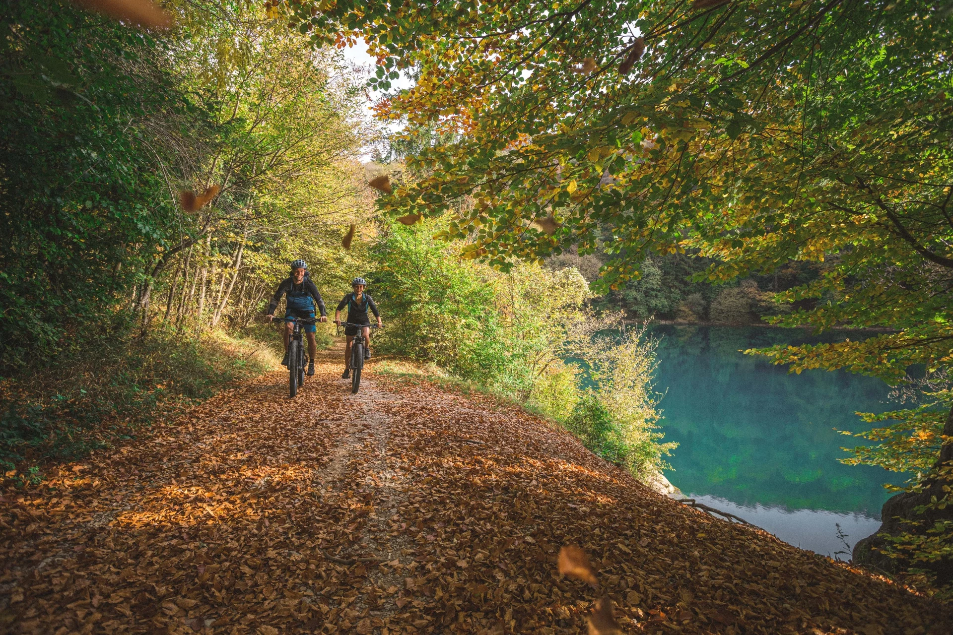 After setting off in Vezzano, descend via Fraveggio and Padergnone to Lago di Toblino until you reach the eponymous castle, which sits enthroned on a rocky promontory in the lake. A steep climb then begins up a tarmacked minor road (closed to traffic) to Ranzo, a somewhat remote village, but all the better for it. A spectacular road carved through the rock takes you back to the valley floor and you then head north-east through the villages of Lon, Ciago and Covelo until you reach Monte Terlago, changing several times between road, forest track and simple trail. The route becomes a bit more difficult shortly before the idyllically situated Lago di Lamar and shortly before the village of Terlago. After Lago di Terlago, you then continue along a cycle path back to the starting point in Vezzano.