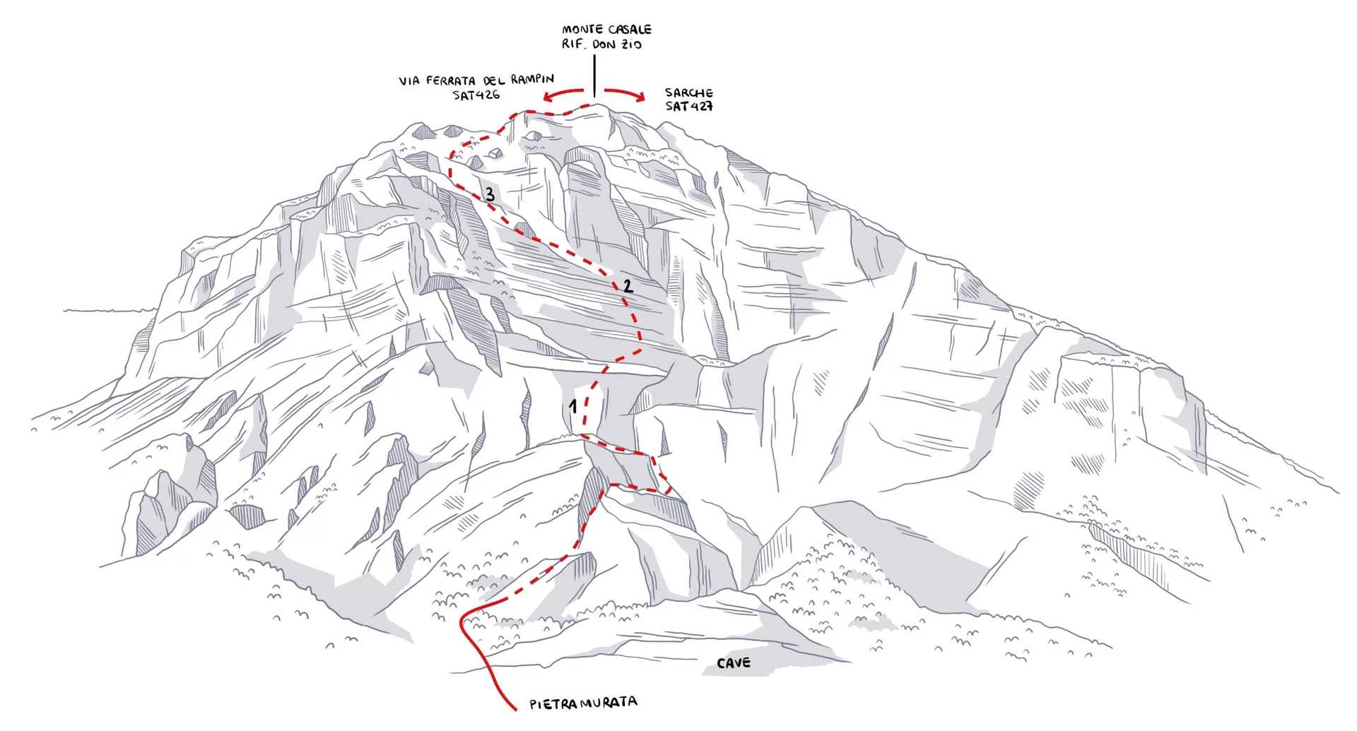 The first section has vertical stretches in clefts and dihedrals followed by atraverse to the right and then a diagonal bend back towards the left acrossshort rock walls and ledges up to the summit of Croz del Pin (1). From here youstart crossing the smooth expanse which is the wall of Monte Casale. Rungsand stirrups (2) help you across the ramparts up to an elevation of 1200 m,where you come across the logbook (3). This marks the end of the difficultsection but the ascent continues with another 400 m of elevation gain withshort bolted sections before you reach the summit of Monte Casale and, soonafter, the mountain hut Rifugio Don Zio.