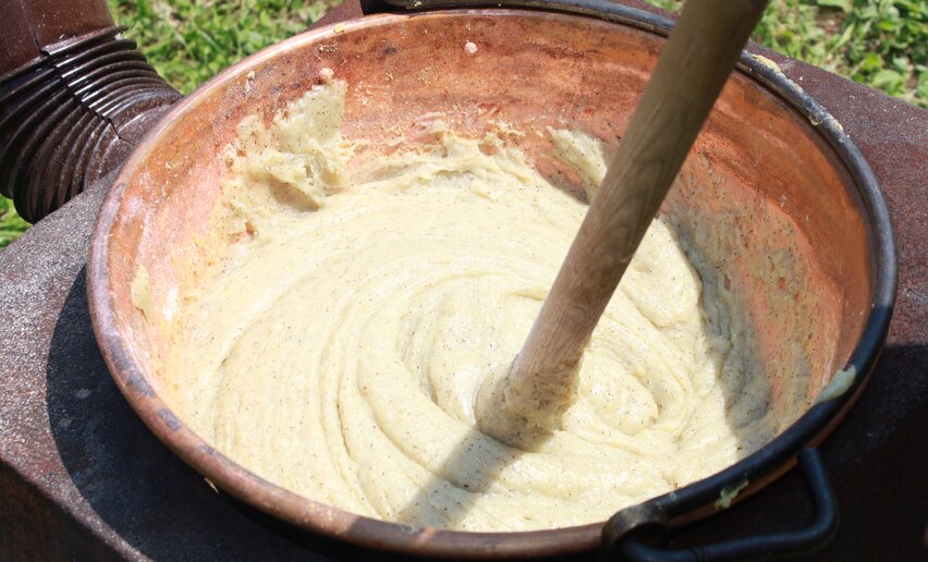 In the square in Bezzecca, Carnival dumplings and 'Grostoi' are distributed to celebrate Carnival Thursday.