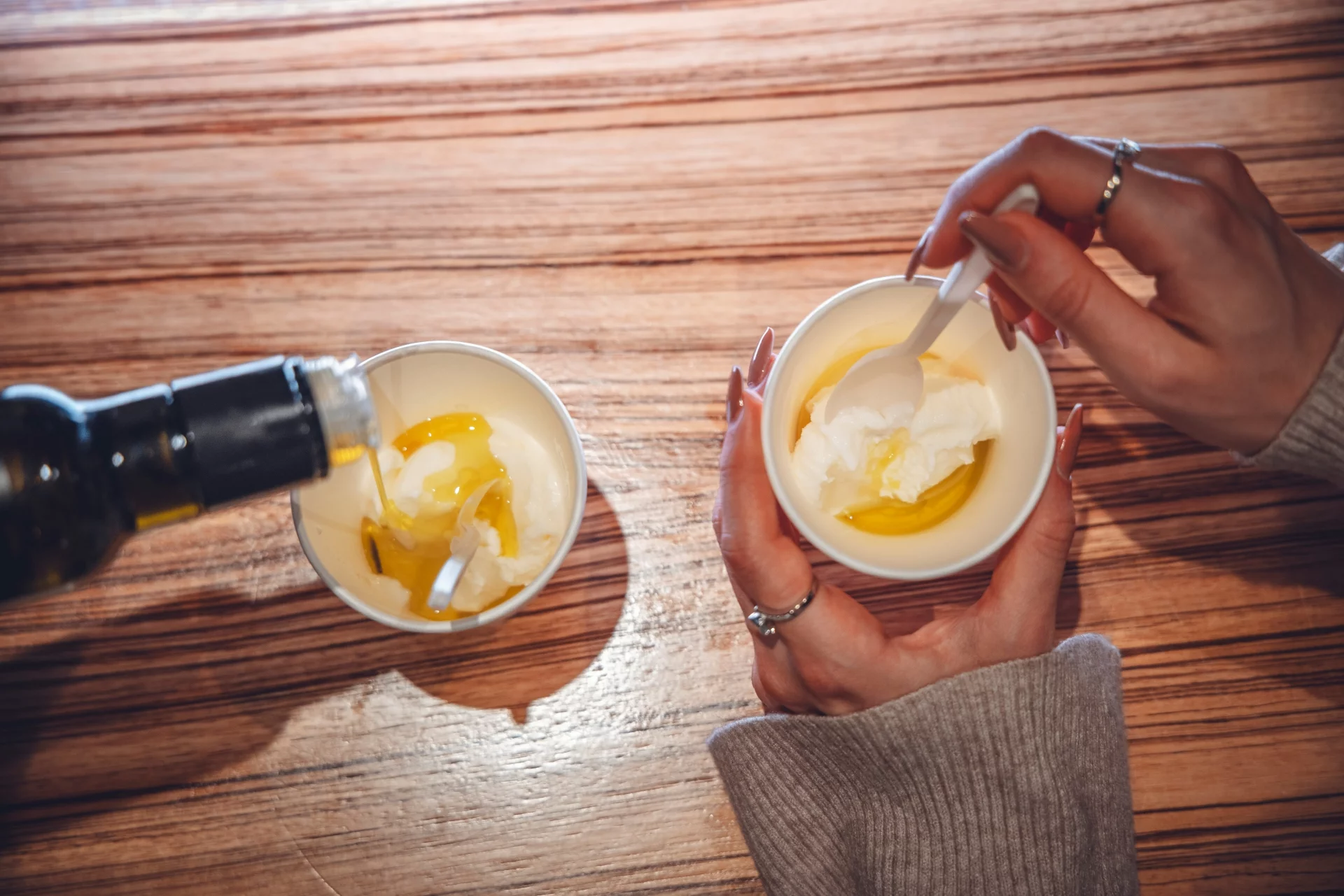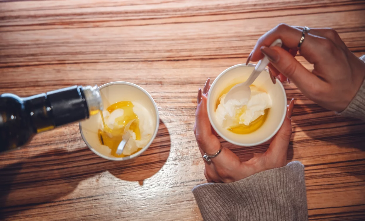 To end on a sweet note, artisanal yogurt ice cream enhanced with lemon- and orange-flavored oils, accompanied by a rich buffet of traditional snacks, pan di molche, and specialties with olive powder.