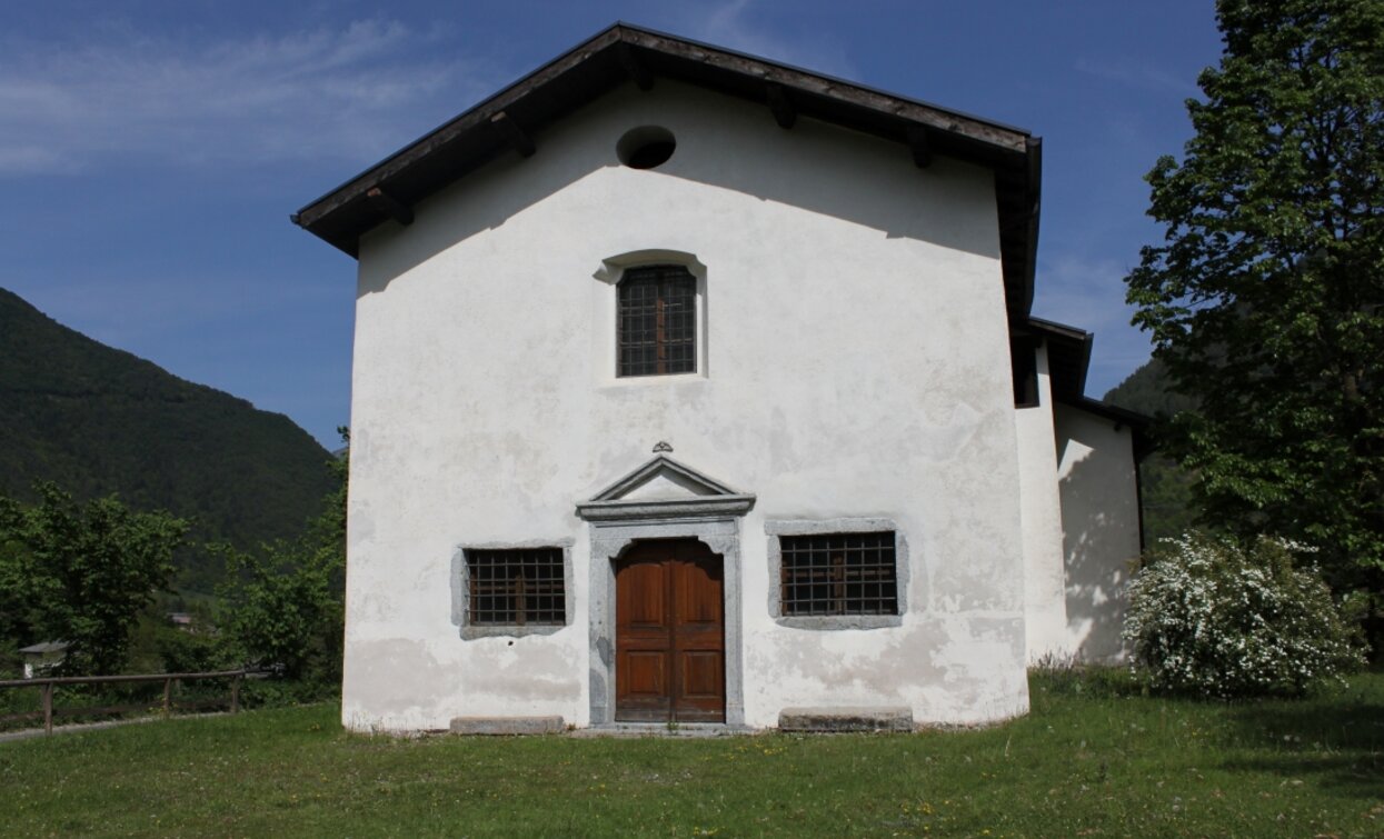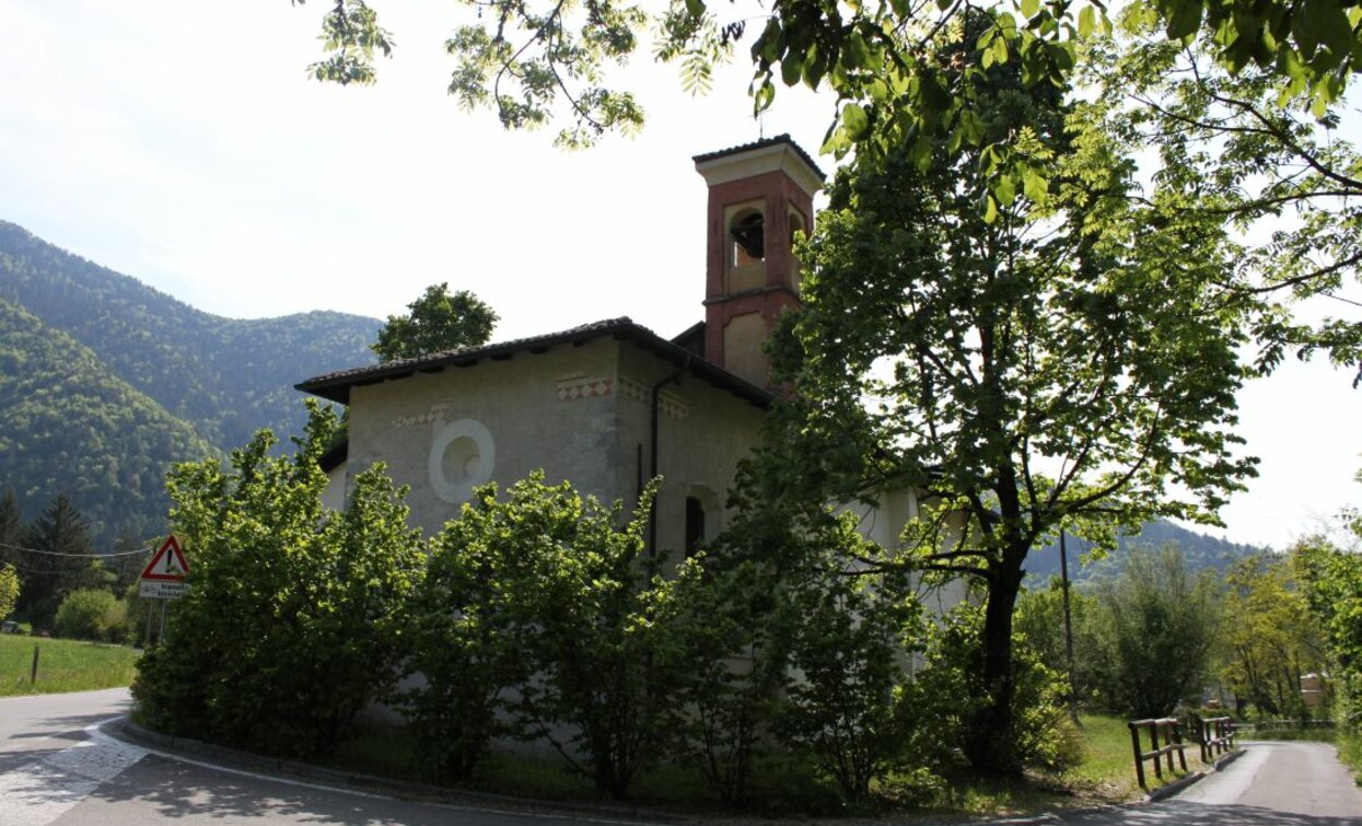 Along the cycle path between Bezzecca and Tiarno di Sotto, the church appears almost unexpectedly, surrounded by the open meadows of Valle di Ledro.