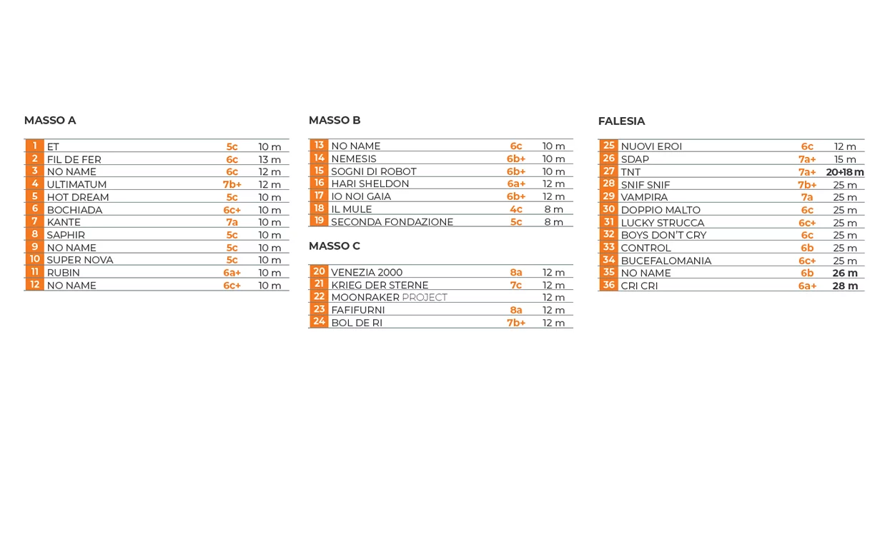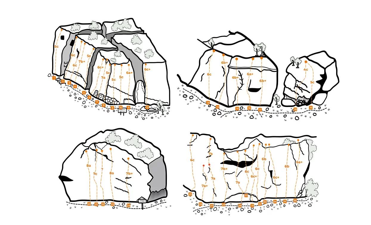 The absolute must on this crag is “Fafifurni” but this route should only to be attempted by those with prehensile fingers made of steel. There are also many bouldering routes on the rocks surrounding this crag.
