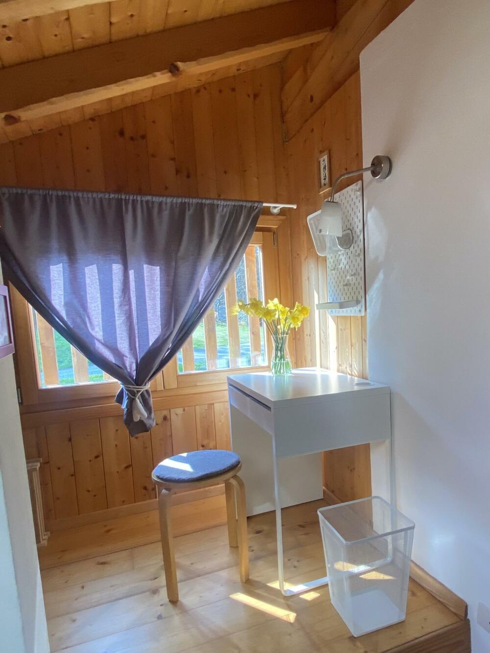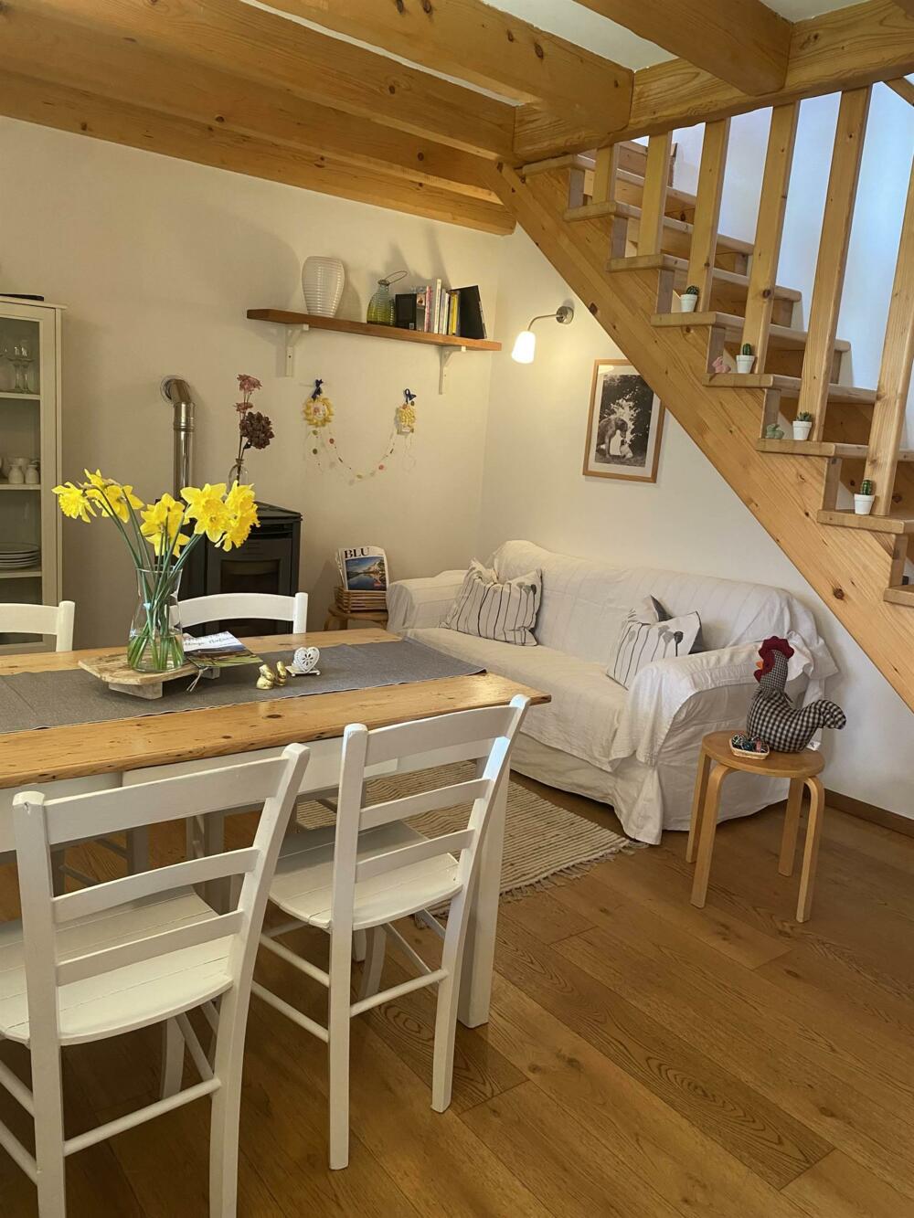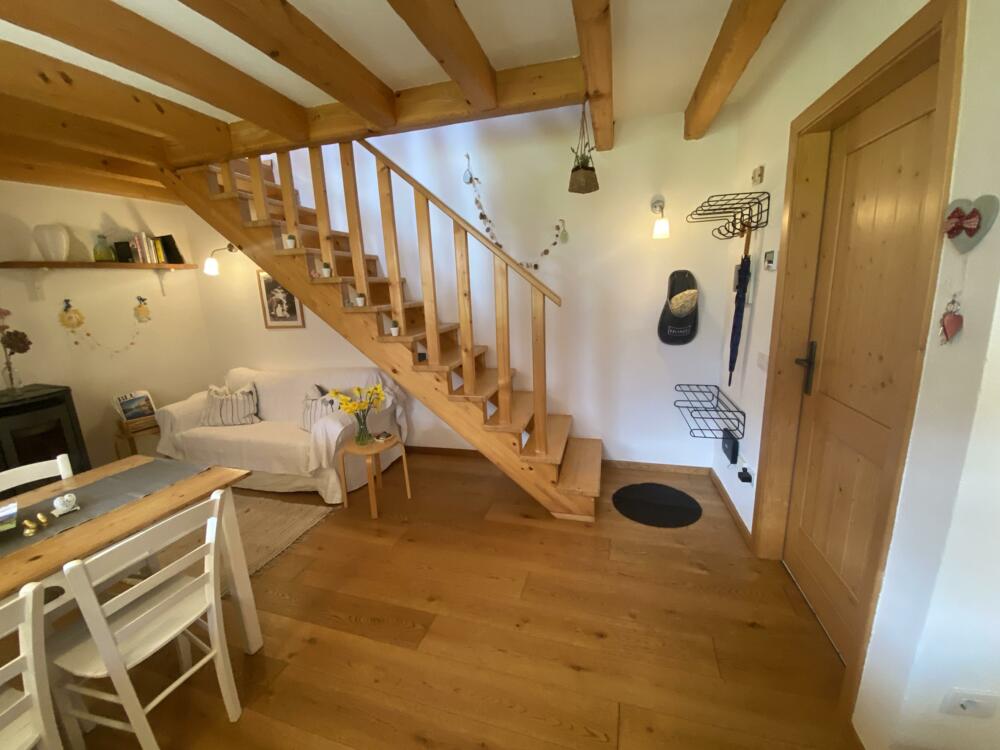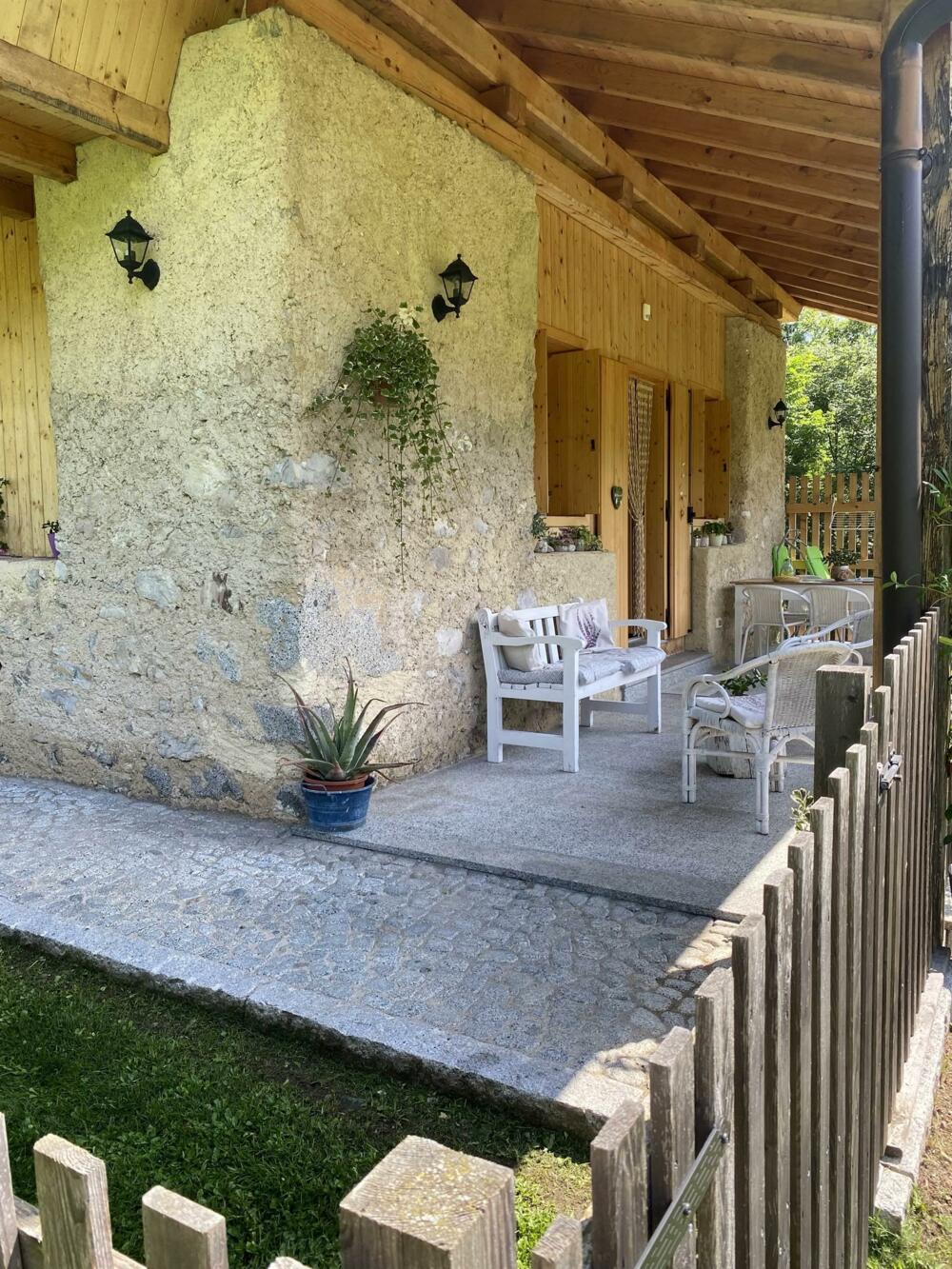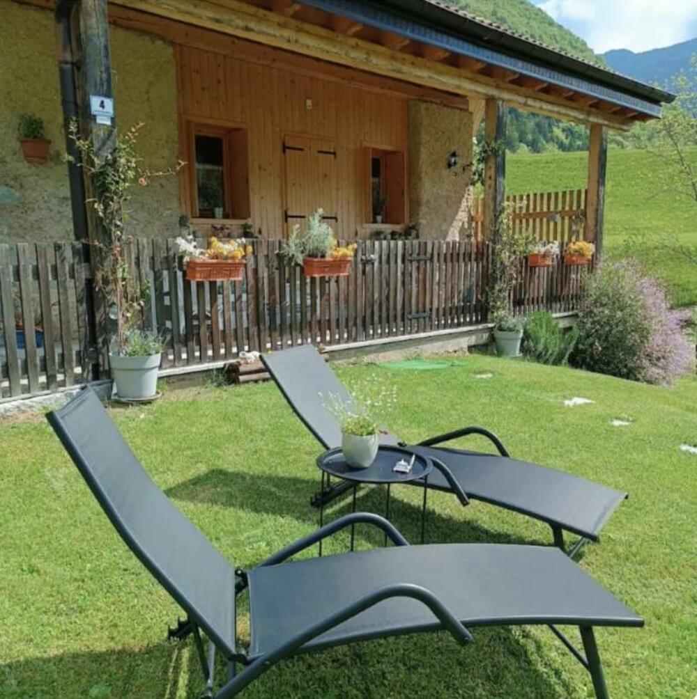 Cozy cottage surrounded by greenery. Excellent location. Located 700 m from Bezzecca. Near the cycle path to Lake Ledro. Fenced porch with green space for your dog’s comfort and safety. Large sunny lawn. On the first floor: equipped kitchen (refrigerator, dishwasher, microwave, and oven), living area (TV), bathroom. Upper floor: open space used as a sleeping area with a small office corner (wifi). Heating for winter stays. Service room for bicycle storage and washing machine. Private parking.