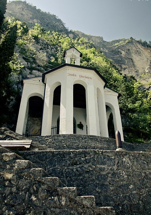 La cappella di Santa Barbara, che spicca bianca contro la roccia della montagna, fu costruita negli anni '20 durante i lavori per le condutture che portavano l’acqua dal Lago di Ledro alla centrale idroelettrica di Riva del Garda ed è dedicata alla santa patrona dei minatori.