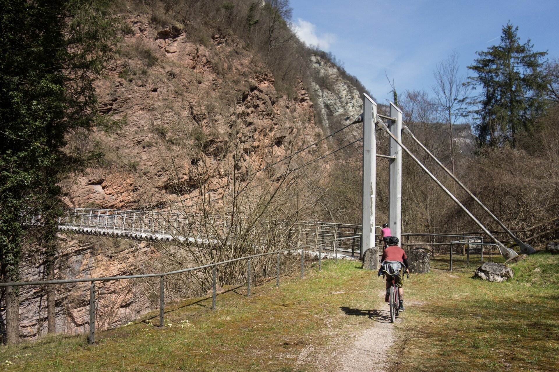 Il nostro punto di partenza è a Arco. Seguiamo la pista ciclabile fino al margine nord della città vecchia. Da lì procediamo lungo Via Caproni Maini dopo aver attraversato il ponte. Proseguiamo dritti superando il Ponte Romano a Ceniga sulla nostra destra e continuiamo fino al ponte successivo vicino a Dro. Non attraversiamo questo ponte ma teniamo la sinistra, seguendo la strada principale per qualche decina di metri. I segnali MTB ci indicano dove girare a sinistra. Prendiamo la strada sterrata, seguendola fino all'incrocio per il Lago Bagattoli. Qui teniamo la destra, scendendo verso lo stagno incantevole, prima di proseguire sulla strada statale. Mantenendo la sinistra, seguiamo la strada in direzione di Pietramurata. Poco dopo aver passato la stazione vicina, giriamo a destra, prendendo la pista ciclabile presso la Centrale di Fies. Raggiungiamo Pietramurata e infine Sarche. Alla fine della pista ciclabile teniamo la sinistra, attraversiamo il ponte e seguiamo la strada statale in direzione di Comano Terme. Saliamo alcune curve a gomito prima di arrivare all'ingresso della pista ciclabile nella gola sulla nostra destra. La seguiamo fino alla fine, per poi continuare di nuovo sulla strada statale. Dopo qualche centinaio di metri, scendiamo per la strada sterrata verso il Ponte Balandin alla destra. Dopo aver attraversato il pittoresco ponte sospeso, risaliamo dall'altro lato della gola, fino a Ponte dei Servi. Attraversiamo questo ponte e continuiamo per qualche centinaio di metri in direzione di Sarche. Svoltiamo nettamente a destra su una stradina che conduce nel bosco, fino a raggiungere le scuderie. Tenendo la sinistra, proseguiamo dritti, fino ad arrivare al paese di Godenzo. Dopo aver superato la chiesa, manteniamo leggermente a destra e scendiamo fino a incontrare la strada provinciale 213. Attraversiamo la strada ed entriamo nel paese di Poia. Tenendo la sinistra, usciamo dal paese in direzione sud, paralleli alla strada provinciale, lungo una stradina di campagna. Proseguiamo dritti al primo bivio e poi giriamo a destra al secondo. Scendiamo nella valle del Torrente Dal, e torniamo a Campo Lomaso. Una volta raggiunta la strada statale, teniamo la destra e poco dopo arriviamo a Villa Campo. Dopo aver passato l'ingresso dell'imponente villa, giriamo a sinistra seguendo le sue mura, per poi proseguire verso sud su una strada sterrata attraverso i campi. Pedaliamo lungo tutta la strada sterrata, poi giriamo a destra verso il bosco che delimita i campi. I segnali per il percorso verso Stumiaga ci portano oltre una fattoria pittoresca e su un'altra strada sterrata. Al bivio successivo, incontriamo una strada asfaltata e teniamo la destra, continuando su tranquille strade di campagna, finché usciamo su Via Bleggio. Poi attraversiamo la strada verso la fattoria, dove passiamo un crocifisso. Tenendo la sinistra, proseguiamo sulla strada sterrata in direzione del paese di Cornelle. Una volta su questa piccola strada, continuiamo dritti nel bosco con qualche piacevole salita e discesa, fino a incontrare la strada statale. Siamo ora nei pressi del Passo del Ballino. Seguendo la strada, poco dopo aver attraversato il Lago di Tenno, incontriamo una rotonda dove prendiamo la prima uscita, continuando lungo la pista ciclabile verso Pranzo. Al semaforo all'ingresso del paese, giriamo a sinistra attraversando il centro e raggiungiamo la strada principale. Salimo per qualche metro e attraversiamo la strada principale, prendendo la stradina che ci conduce in discesa tra i castagni, con il Castello di Tenno proprio davanti a noi. Una volta tornati sulla strada provinciale, l’attraversiamo e saliamo per qualche decina di metri su Via dei Molini, che seguiamo fino al Castello di Tenno.