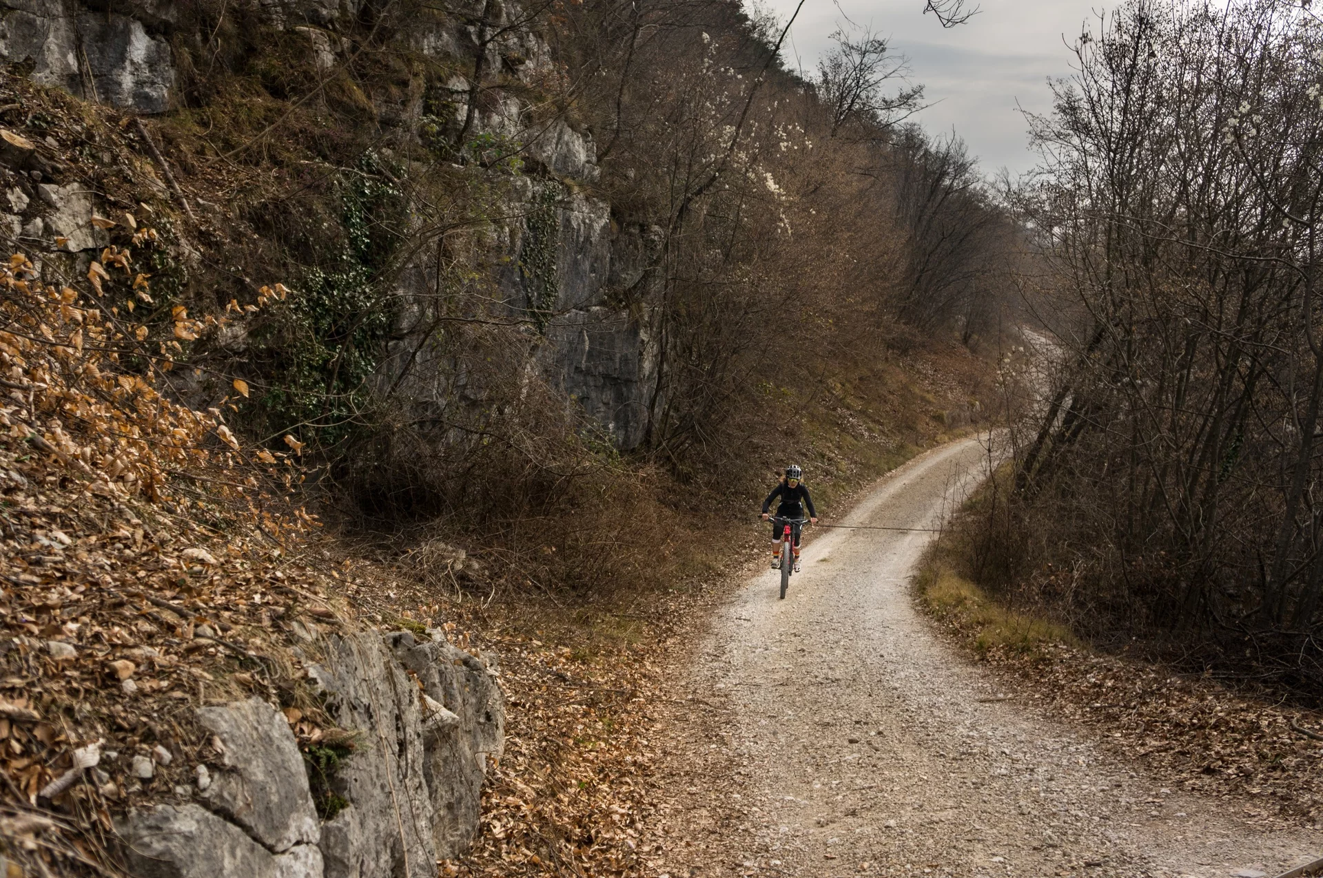 Continua a destra sulla strada principale, e dopo circa 200 metri svolta a sinistra per salire su Via Coste, raggiungendo un abitato con lo stesso nome. Questa strada è caratterizzata da una vista molto italiana: le stazioni della via crucis, che ti portano fino a una piccola chiesa. Qui continua diritto, seguendo la strada per scoprire la segnaletica del percorso che ti indica di proseguire sulla strada forestale. Procedi in discesa sul piacevole sentiero ondulato, stabile e abbastanza scorrevole. Alla fine del bosco, continua dritto fino a raggiungere il segnale di stop dove devi tenere la sinistra su Via Trebi. Successivamente ti troverai in un’area archeologica da cui devi uscire seguendo la strada principale. Se vuoi allungare la tua avventura, puoi sempre seguire le indicazioni del percorso 753, che poi si ricongiunge a questo. Altrimenti, proseguendo dritto sulla strada, inizierai a scendere poco dopo, con il Lago di Cavedine e la valle della Sarca sotto di te.