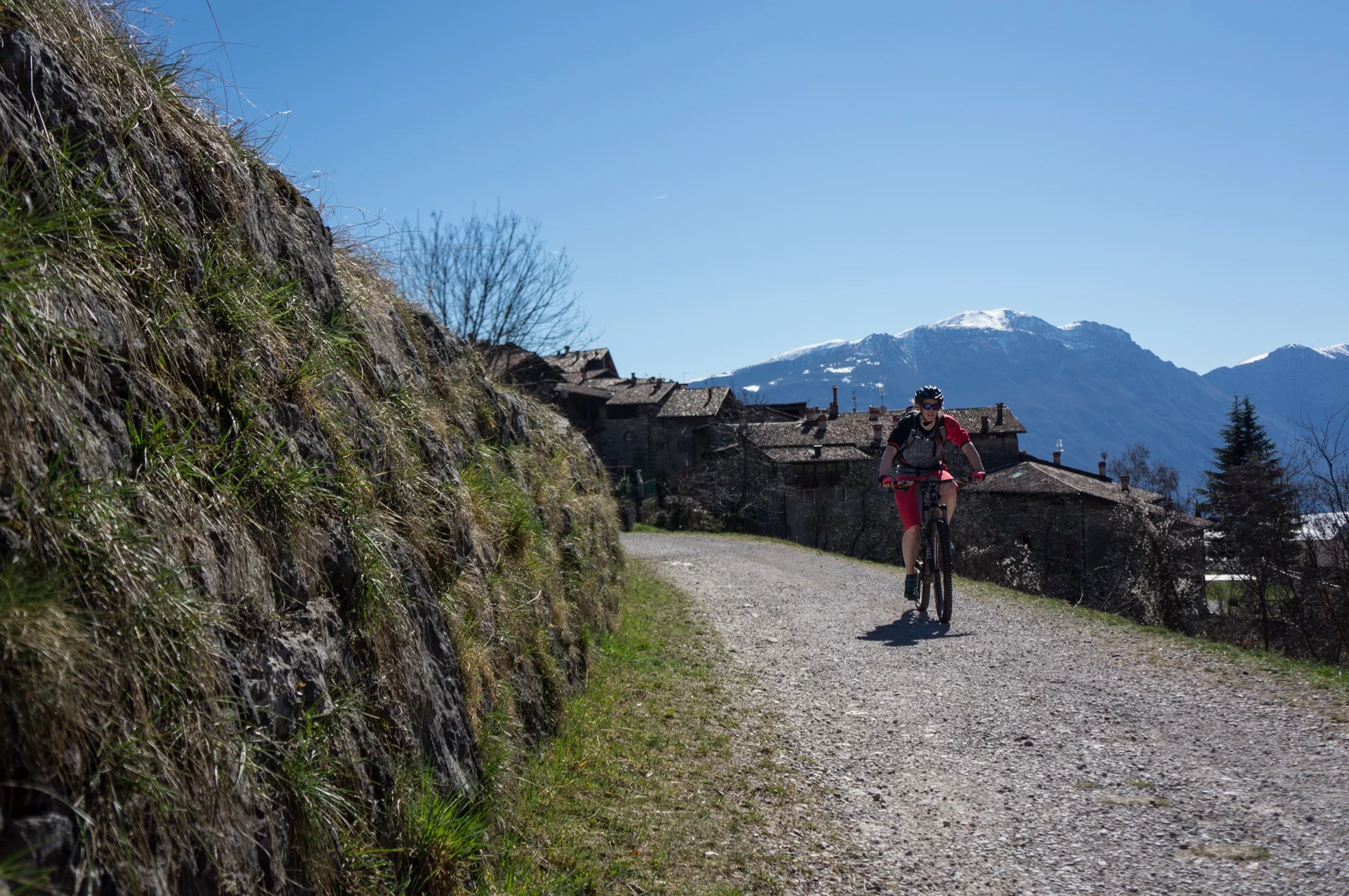 Questo è l'inizio della prima salita, impegnativa. La via da percorrere è da qui segnalata molto bene e possiamo concentrarci a spingere sui pedali per superare le ripide rampe cementate. Seguirà un tratto sterrato e poi su asfalto fino a Volta di No. Giunti all'incrocio con la strada principale per Tenno, in corrispondenza di un tornante, svoltiamo a destra per poi, dopo poche decine di metri, seguire le indicazioni del percorso che ci fanno tenere la sinistra. Ancora salita sulla bellissima strada del Pil, il fondo è a tratti un po' sconnesso ma le pendenze sono qui un po' più dolci. Salendo possiamo qui ammirare un panorama notevole Riva e l'Alto Garda. Al termine di questa salita, incontriamo una strada secondaria asfaltata e le indicazioni ci guidano verso sinistra giungendo in breve a cospetto del Castello di Tenno. Tenendo qui la destra continuiamo a salire sulla strada principale, percorsi 2 tornanti, attraversiamo la carreggiata imboccando l'adiacente strada sterrata che ci condurrà fino a Ville del Monte. Nei pressi della chiesa troviamo anche una fontana e giungendo nuovamente a incontrare la strada principale. Attraversiamola proseguendo verso sinistra e, dopo pochi metri, svoltiamo a destra seguendo le indicazioni per il borgo di Canale.