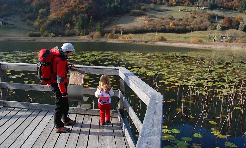 Il Lago Ampola è una piccola pozza rimasta intatta dall’intervento umano e offre così un habitat perfetto per rane e girini, canne e ninfee. Lo stagno è facilmente raggiungibile da Tiarno di Sopra con una breve passeggiata nel bosco o lungo il percorso ciclabile. Beati come rane su una foglia di ninfea. Il Centro Visitatori del Lago Ampola prende il nome dal titolo italiano del romanzo di Tom Robbins ‘Half Asleep in Frog Pajamas’. Lì puoi imparare di più sulla flora e fauna dello stagno. Il periodo migliore per visitare il Lago Ampola e il suo centro visitatori è la primavera, quando fioriscono le ninfee!
