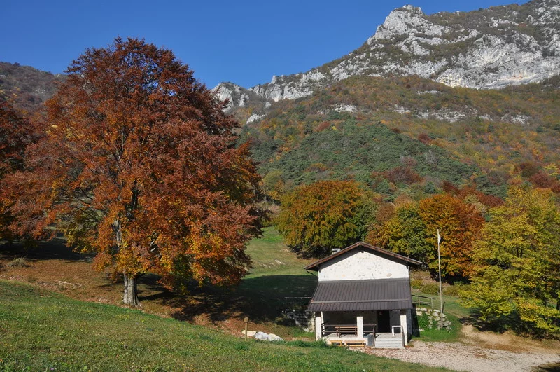 Si raggiunge la bella prateria della malga a quota 946m. Alle sue spalle si nota la cresta “verde” di Cima Nara. Si continua ancora sul sentiero 422B e ci si alza al “Passo Rocchetta” (1159m) e quindi ai “Prati di Guil” (1240m).