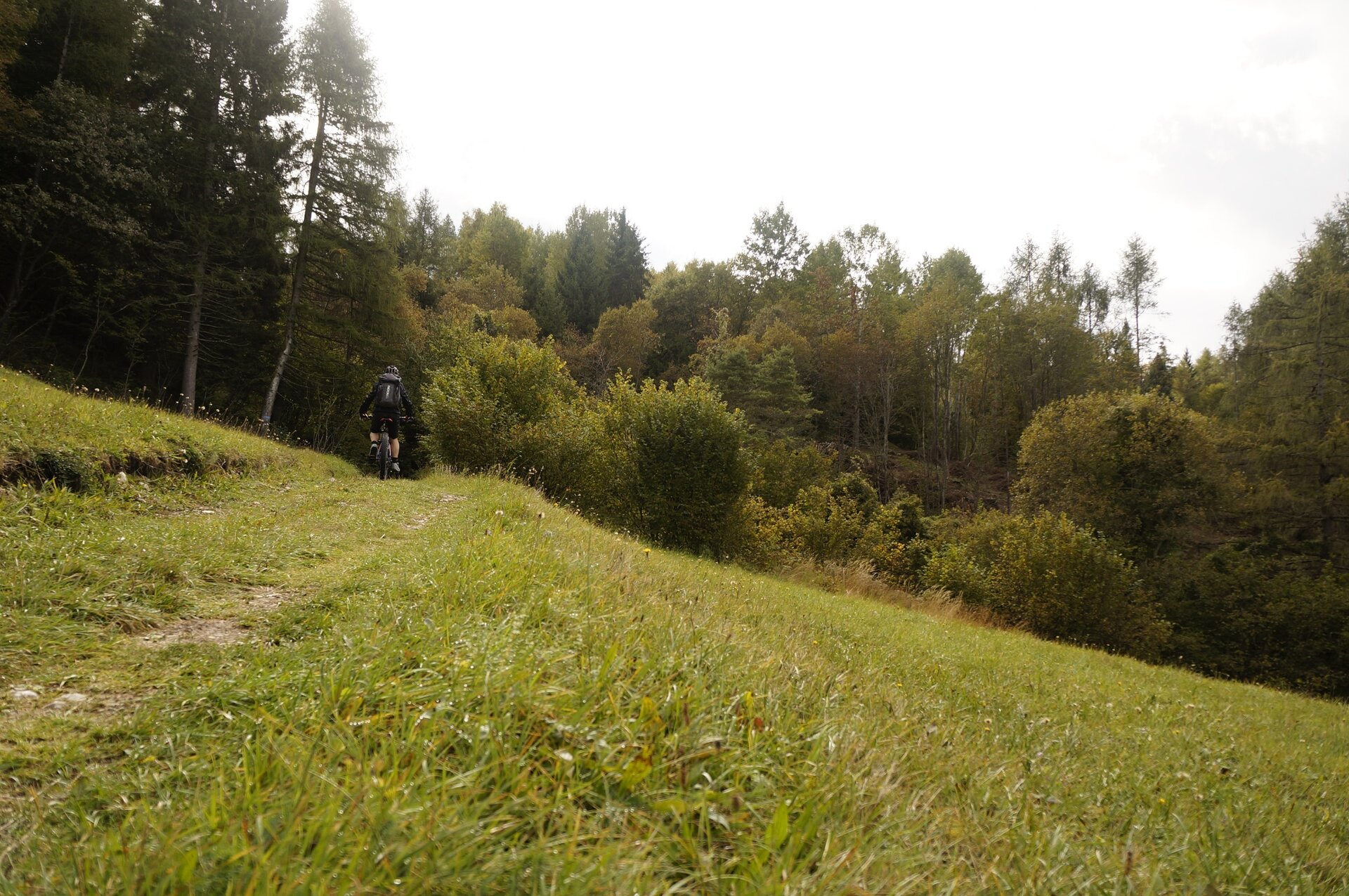 Venendo da Passo Due Sassi imbocchiamo la strada sterrata per Malga Zanga e superata la malga, siamo chiamati a un ultimo sforzo per arrivare a scollinare e incontrare la strada asfaltata. Seguendola verso destra, arriviamo a Passo Santa Barbara. Allo stop, in prossimità del passo, dove troviamo anche una fontana, teniamo la destra, seguendo la strada per un centinaio di metri. Ancora guidati dalle indicazioni, lasciamo la strada principale tenendo la sinistra raggiungendo presto lo sterrato. Affrontiamo qui il tratto di discesa più sconnesso che ci porta a scendere fino a Malga Fiavei.