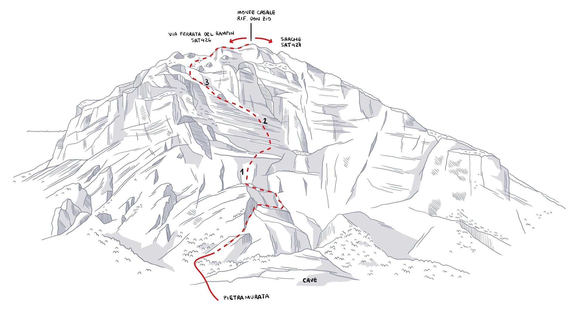 La prima sezione presenta tratti verticali in fessure e diedri, seguiti da un traverso verso destra e poi da una curva diagonale verso sinistra attraverso brevi pareti rocciose e cenge fino alla cima del Croz del Pin (1). Da qui inizi a percorrere la superficie liscia che è la parete del Monte Casale. Pioli e staffe (2) ti aiutano ad attraversare le fortificazioni fino a un'altitudine di 1200 m, dove trovi il libro di via (3). Questo segna la fine della sezione difficile, ma la salita continua con altri 400 m di dislivello con brevi tratti attrezzati prima di raggiungere la vetta del Monte Casale e, poco dopo, il rifugio Don Zio.