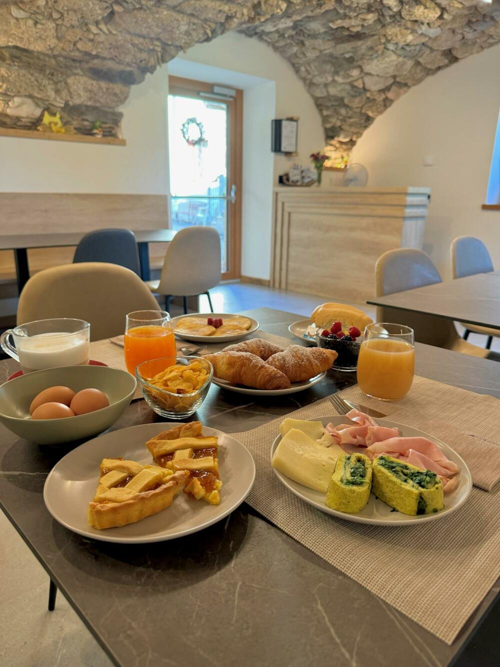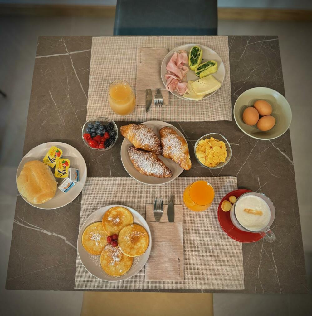 La colazione, servita in un’ampia sala comune, è uno dei punti di forza dell’offerta: un buffet vario e curato, con prodotti dolci e salati, molti dei quali provenienti direttamente dall’azienda agricola. Particolare attenzione è dedicata alla produzione interna, che comprende: