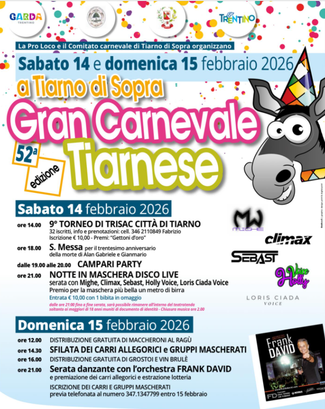 La Pro Loco di Tiarno di Sopra e il Comitato Carnevale di Tiarno di Sopra organizzano la 52° edizione del Gran Carnevale Tiarnese, 14 e 15 febbraio